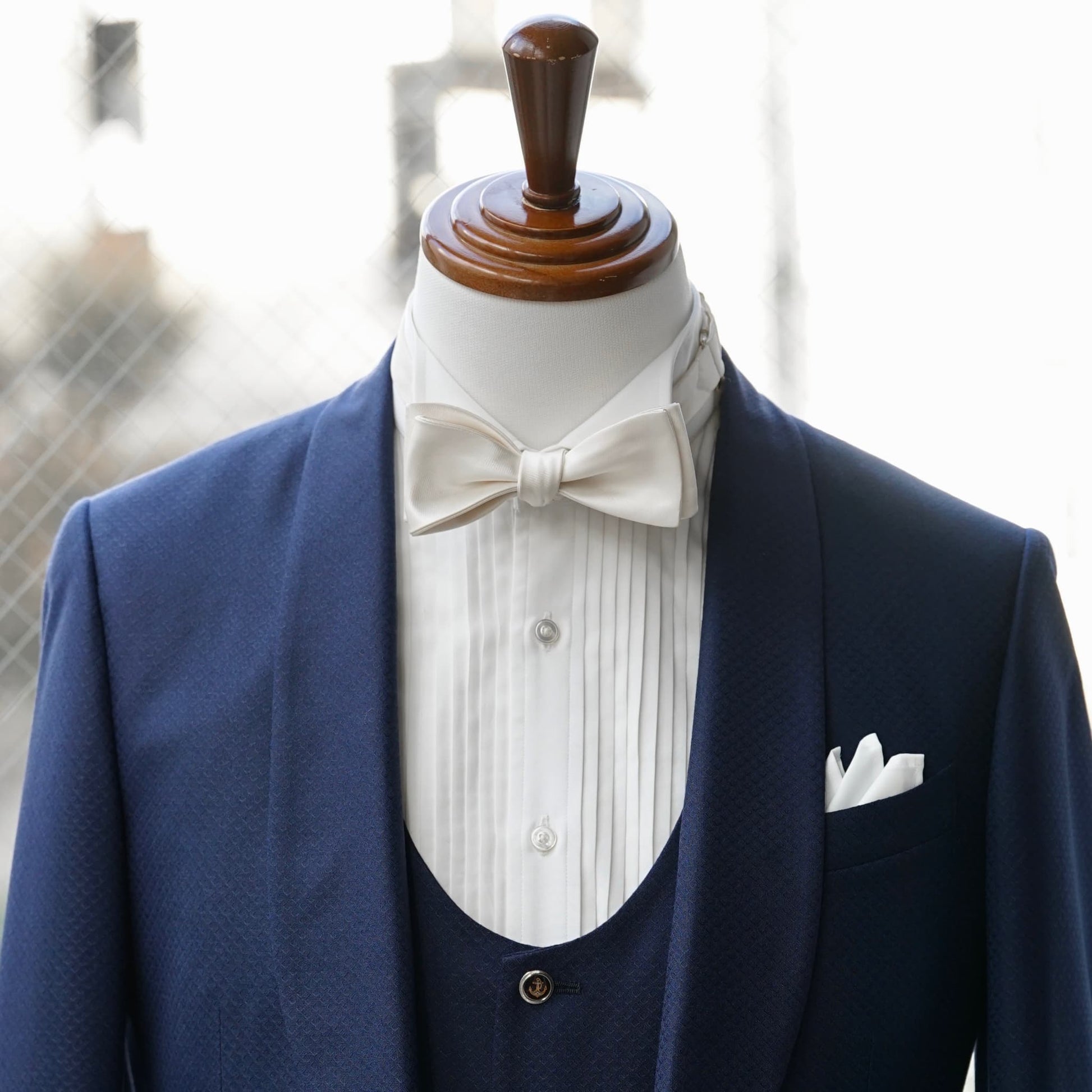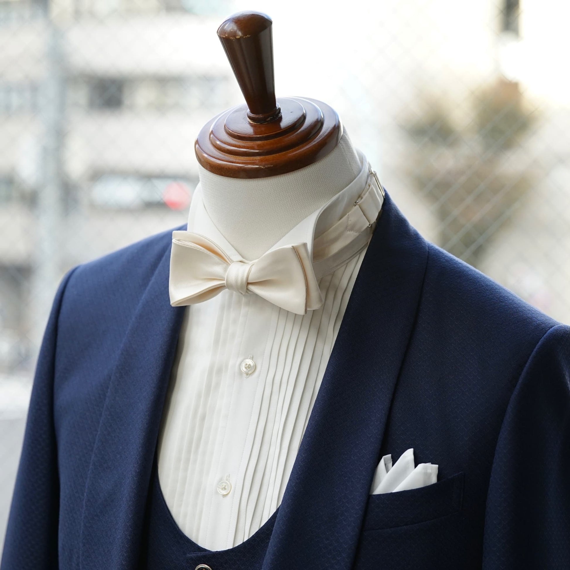 成形されている蝶ネクタイや色違いを含め、店舗にも数多くの蝶ネクタイと小物をご用意しております。