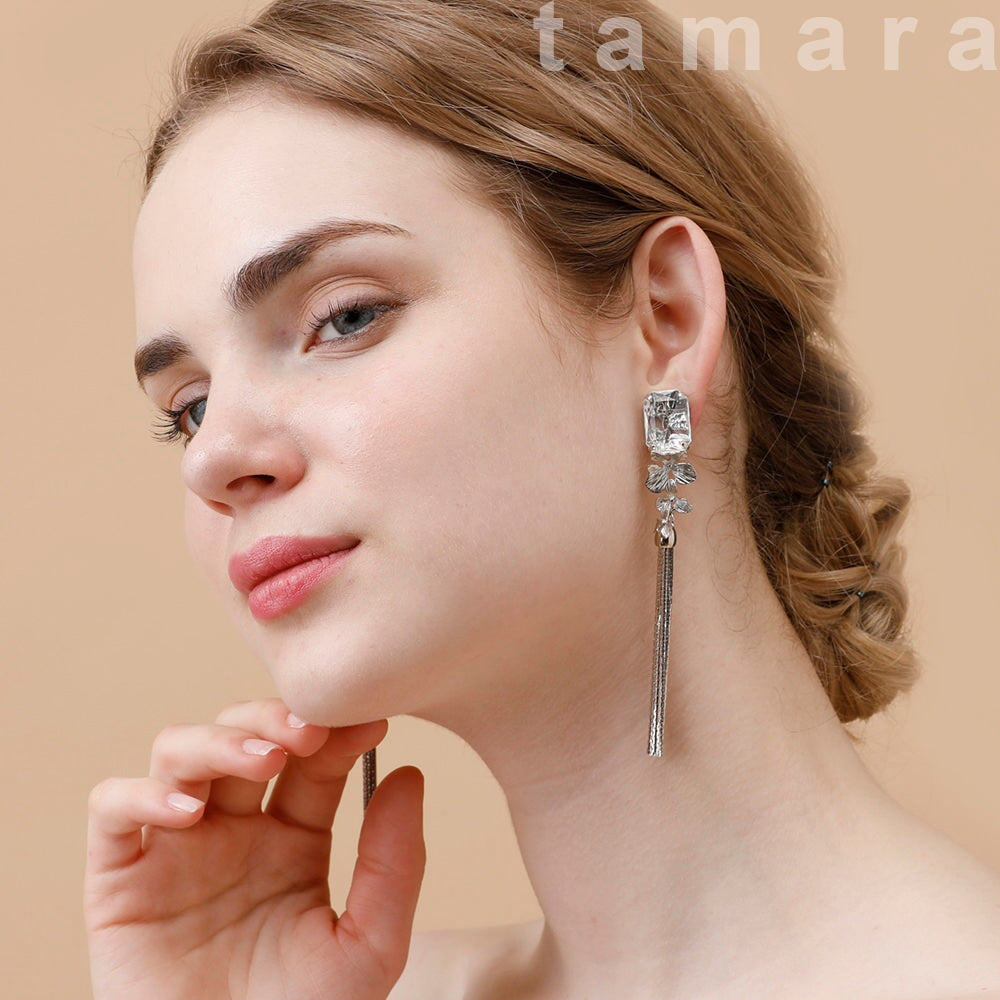澄んだ水をたたえる池に映る庭の草花をイメージしたモチーフです。アールデコ時代に流行したステップカットのクリアストーンで仕立てました。キラキラと光を反射させながら揺れるタッセルが華やかさを演出します。
