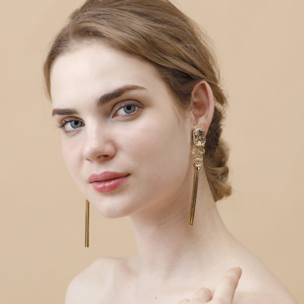 澄んだ水をたたえる池に映る庭の草花をイメージしたモチーフです。アールデコ時代に流行したステップカットのクリアストーンで仕立てました。キラキラと光を反射させながら揺れるタッセルが華やかさを演出します。