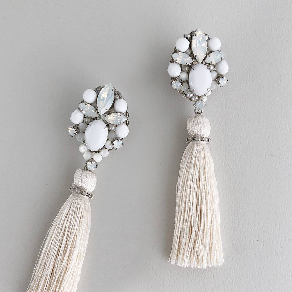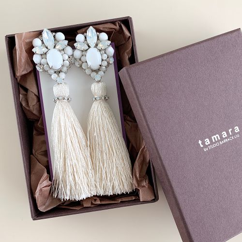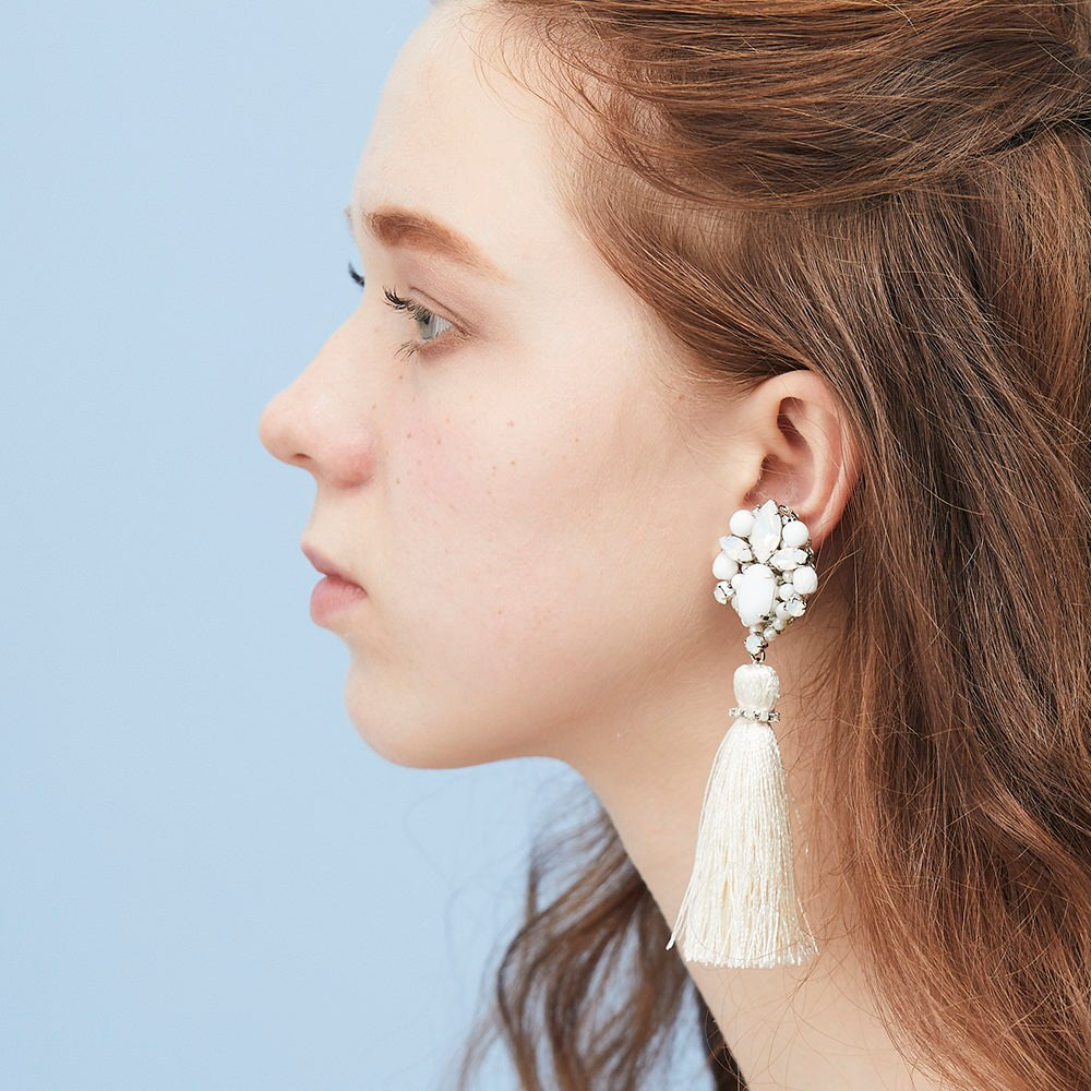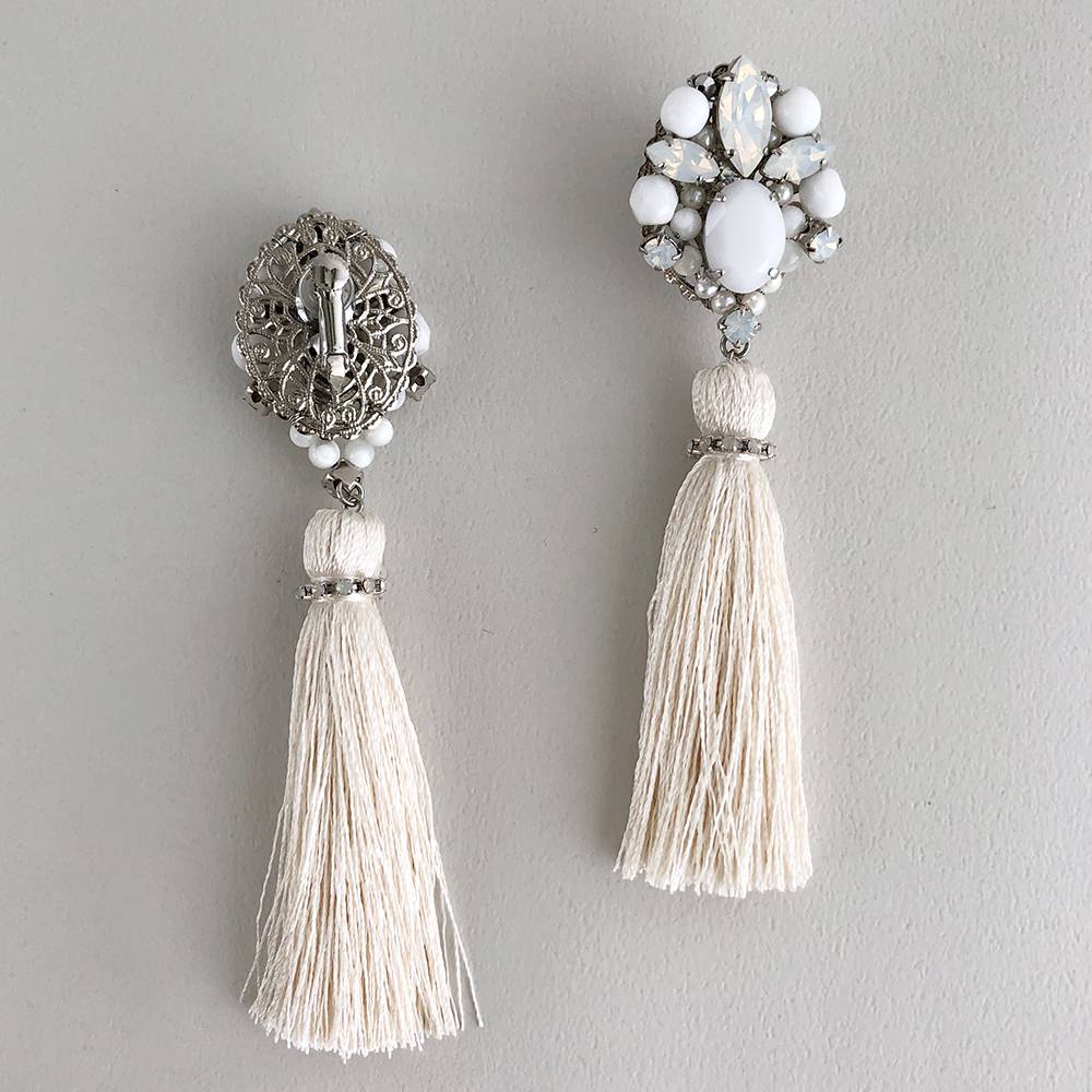 乳白色やマットな質感のホワイトストーンやシェルビーズをミックスした雰囲気と布タッセルの組み合わせがお洒落なピアスです。縦長のシルエットなので房の揺れがとても優雅。