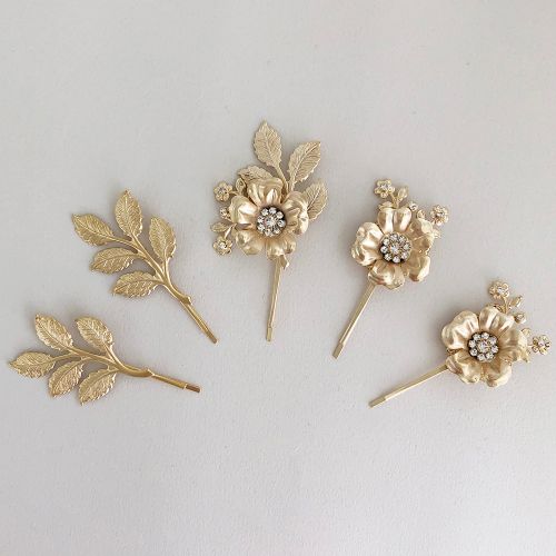 リーフやフラワーモチーフのシンプルなヘアピン5本セット。着け方を工夫して様々な装着が楽しめるセットです。