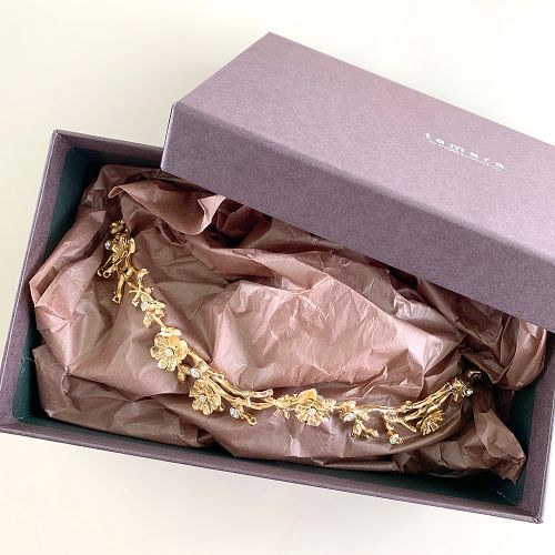 小花や実をつけた枝モチーフのシャビーシックなデザインのカチューシャです。フロントに装着しても、またはバックカチューシャとしても、様々なヘアスタイルに対応できます。ナチュラルな雰囲気の装いがお好きな方に。
