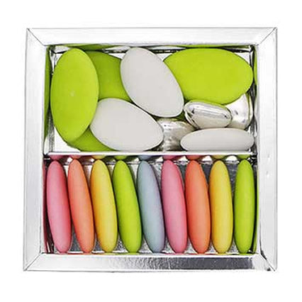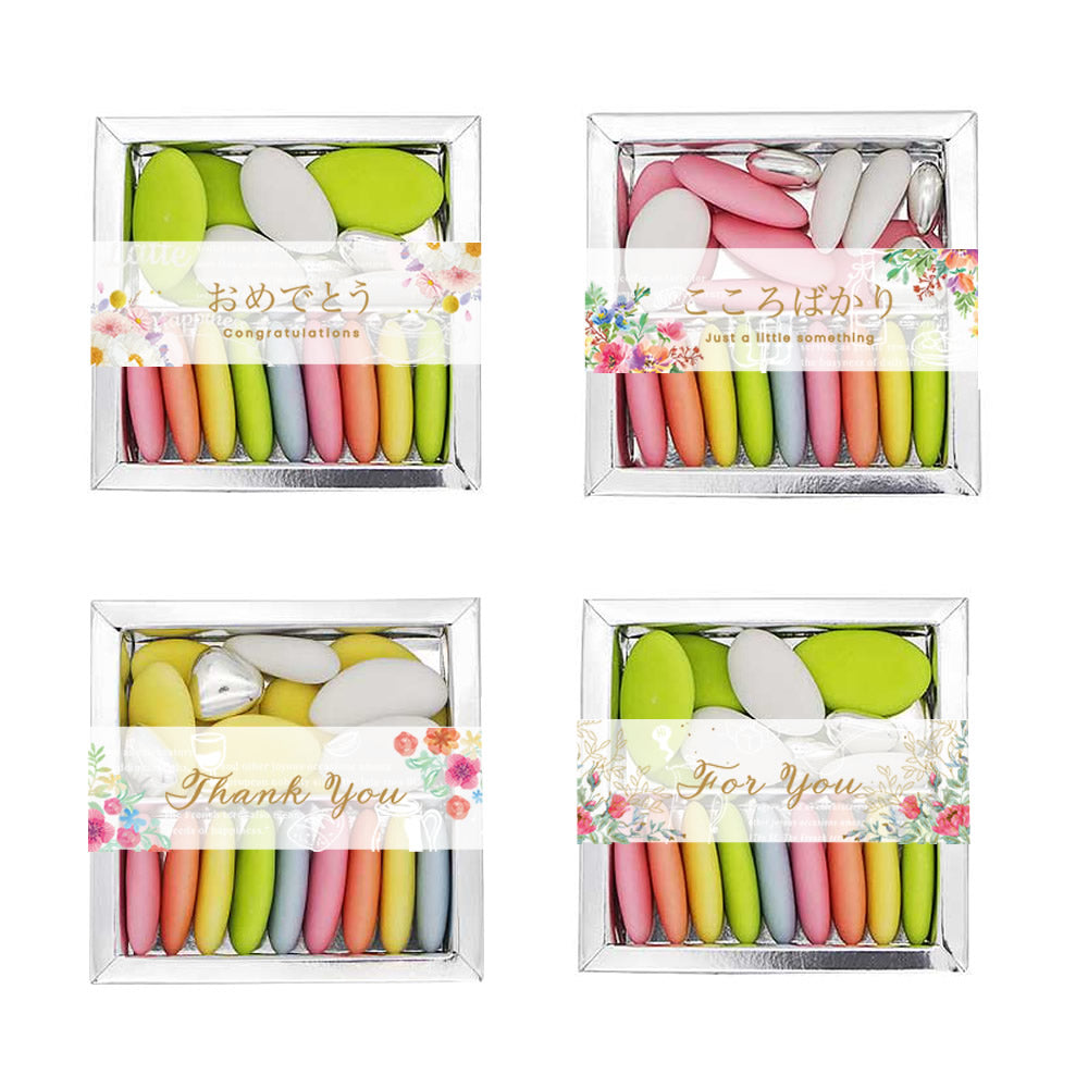 ホワイト(マット)には子孫繁栄の象徴としてイタリア・シチリア産のアーモンドを使用。パステルカラーやシルバーなどのカラフルなお色には甘さを抑えたチョコレートが入っています。珈琲や紅茶など、ティータイムのお供にもぴったりなフランス産ドラジェをお楽しみください。