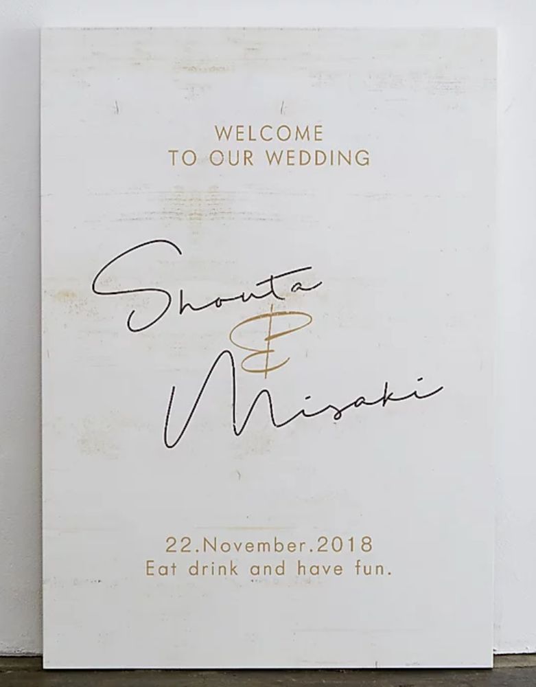 "ゲストを最初にお出迎えするウェルカムボード。ふたりの好みに合わせて組み合わせを楽しんで