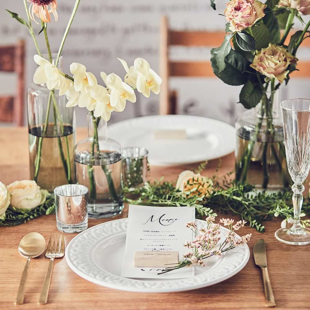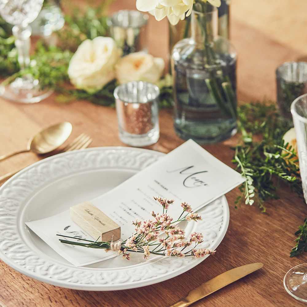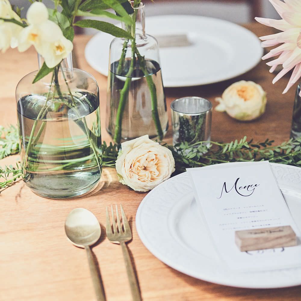 自分の名前が入っているものたちは、なんとなく捨てたくないもの。席札もゲストが必ず持ち帰るアイテムの一つ。その席札も木を使ったブロックなら、ちょっと嬉しい。とても心地の良い木の香りがするクスノキは、御神木の一つとしても有名。お守りとして持ったり、デスクに飾ったりちょっとしたDIYでキーホルダーにしたりと挙式後もゲストが楽しめるアイテムです。またコーディネートされているメニューも一緒にすることで統一されたイメージに。