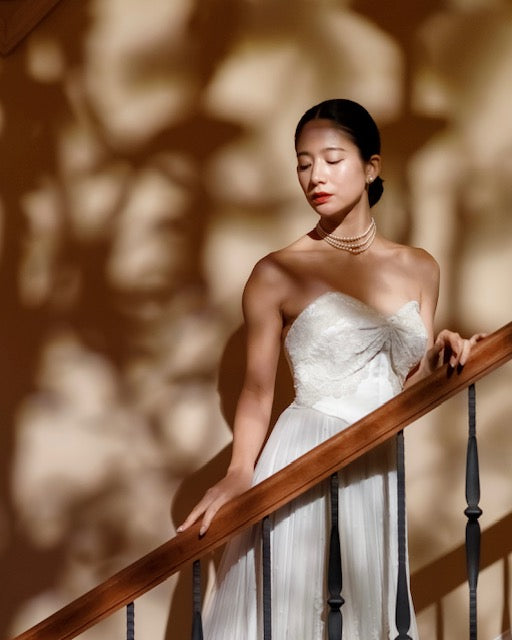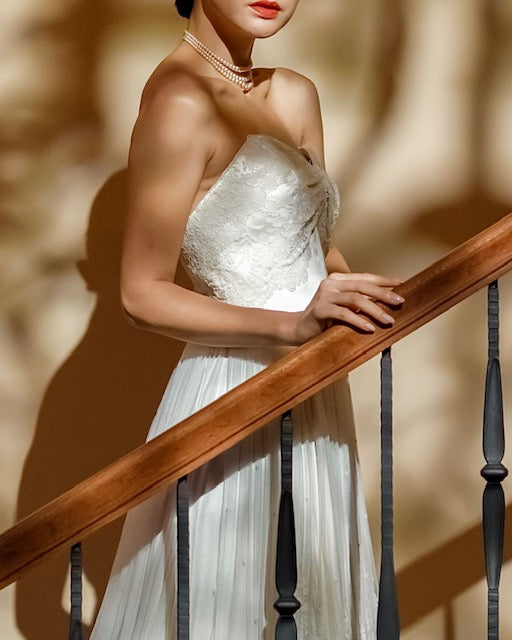 ビスチェには120年前に手仕事で織られた希少なベルギーレースを施しており、スカート部分にはシルクサテンと刺繍を施したシルクチュール を重ねた華やかさと優雅なシルエットのスレンダードレスです。