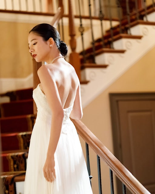 | 素材 | ビスチェ部分 シルク100%サテン アンティークレース スカート部分: シルク100%サテンクレープ 刺繍を施したシルク100%チュール 裏地:コットン100% |