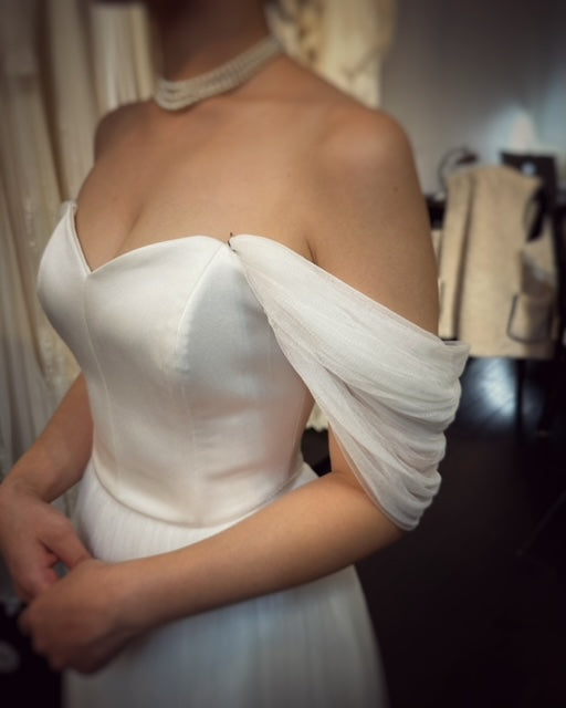 オーダーレンタルドレスなので、オフショルダーにしたり、ボレロと組み合わせたり、好みに合わせて部分的なデザインの変更が可能です。