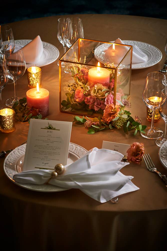 暗くなるシーンをより感動的な演出にするための温かなアイテム。人気のキャンドルを使ったコーディネート。