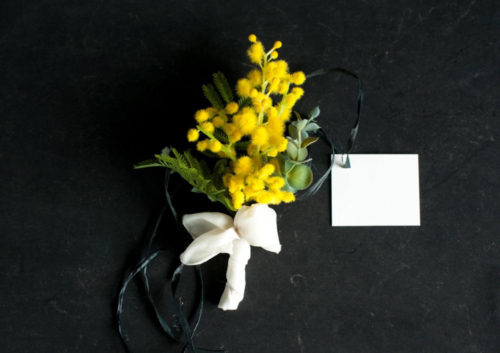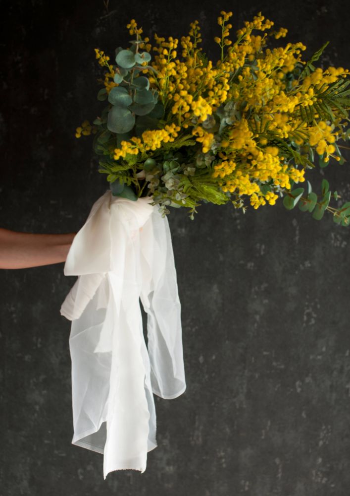 ミモザのナチュラルで優しいイエローの花が、お二人の幸せな笑顔を明るく彩ります。