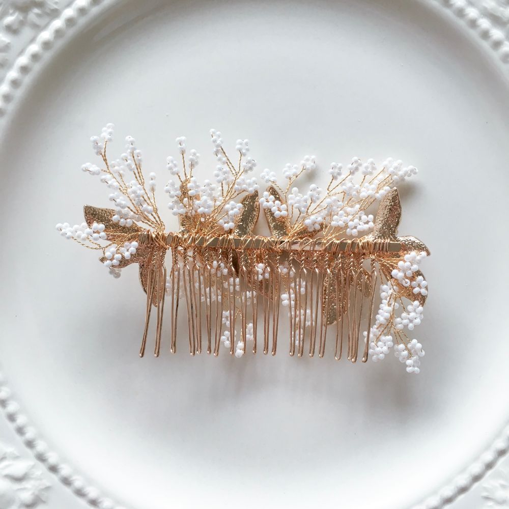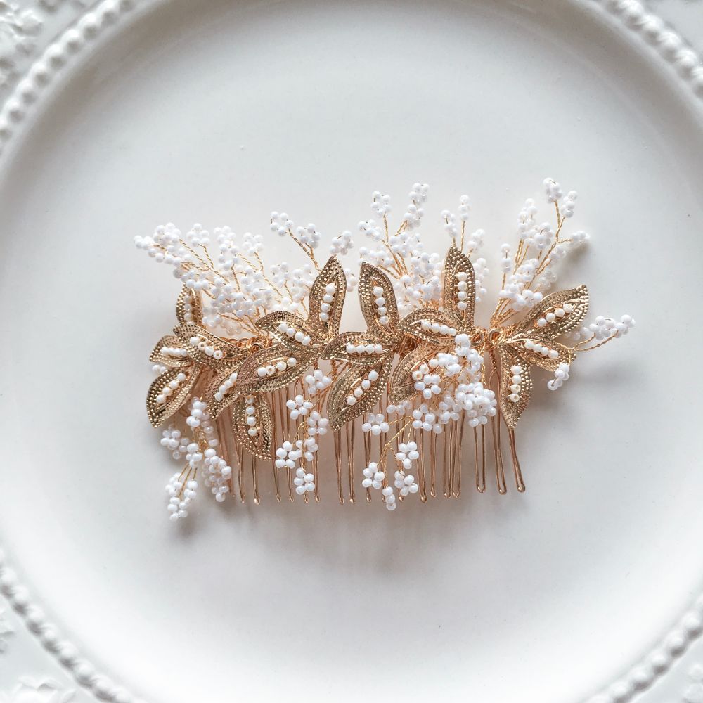【ヘッドドレス】ブライダルヘッドドレス ビーズ リーフ ゴールド h1 【結婚式 ヘアアクセサリー】