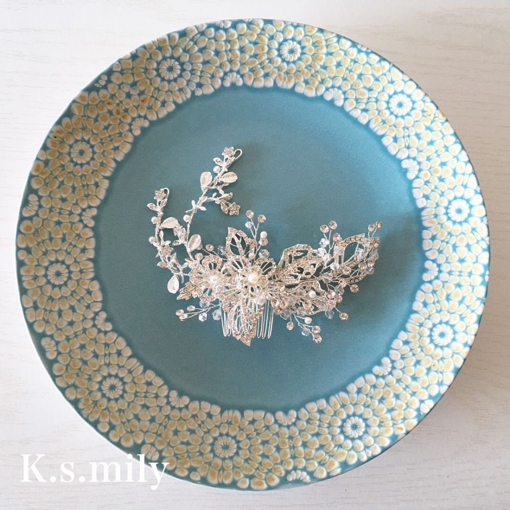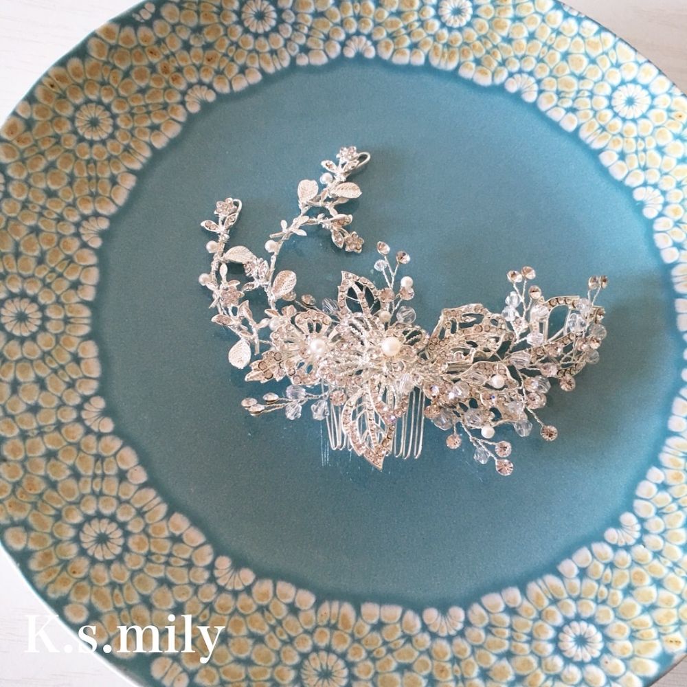 ・繊細なリーフモチーフに、たくさんのパールとビジューを取り付けた美しいデザインのヘッドドレスです。