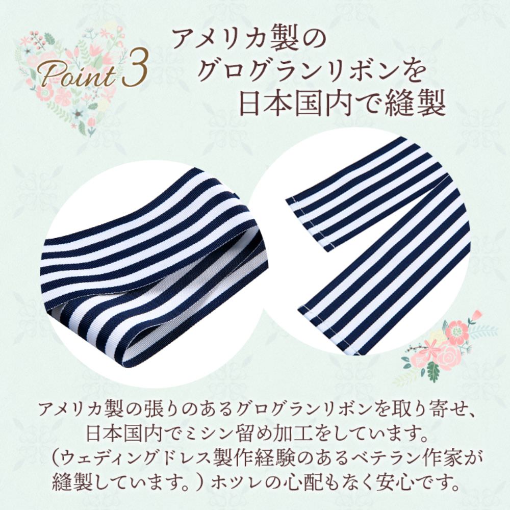 ネイビー&ホワイトのストライプリボンでシンプルながらも、この1点でワンランク上のお洒落なスタイリングが完成します。