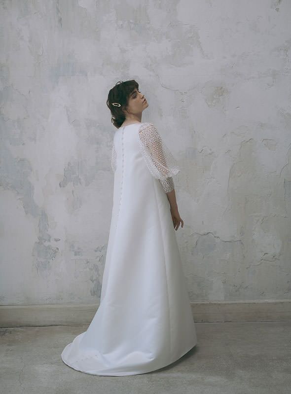 カッティングレースと上品なサテンのミックスマッチ。個性派スリーブとシンプルなシルエットで叶う新しさ。