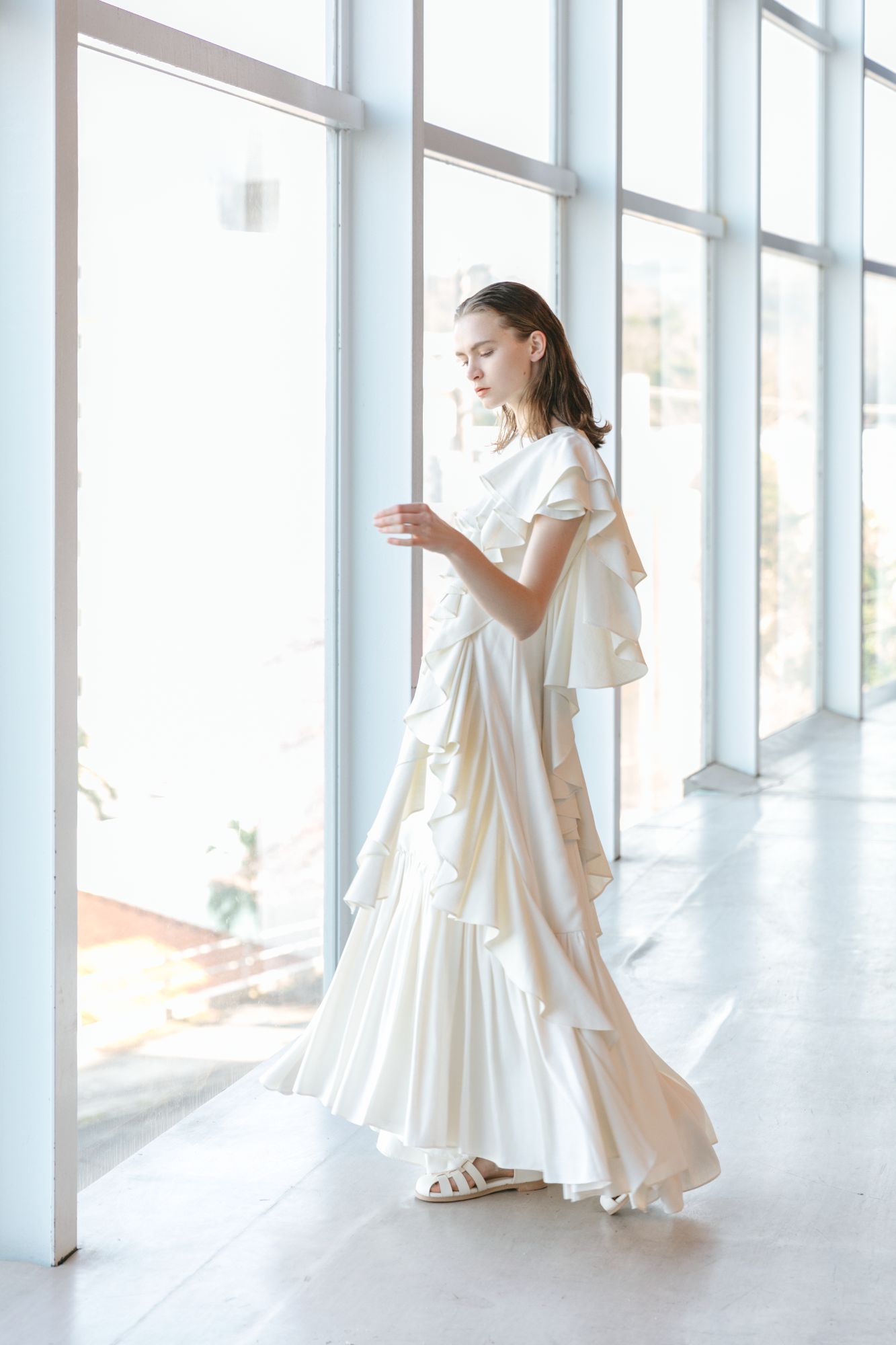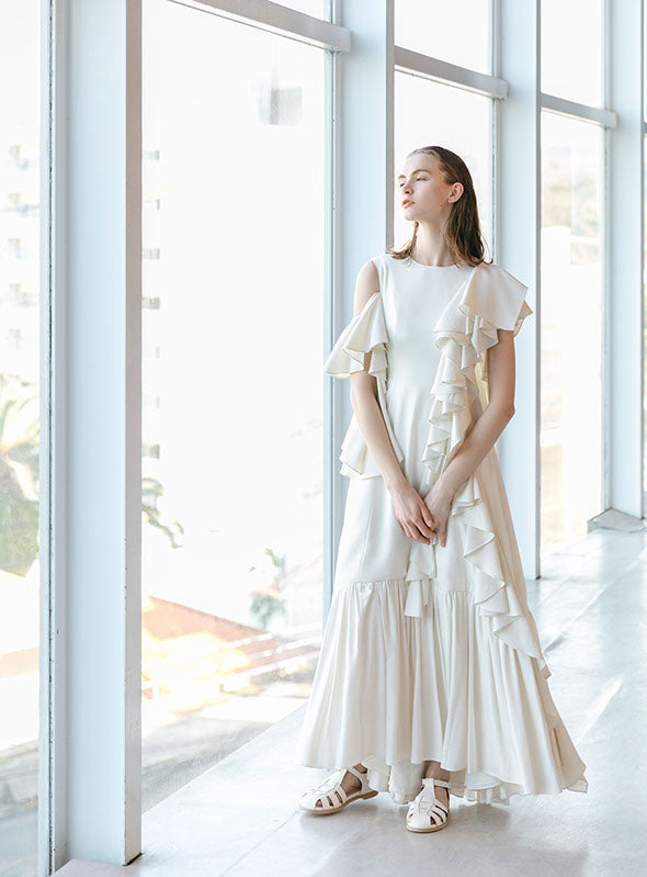 アシンメトリーで魅せるリネンライクドレス。贅沢なフリルで作り出す他にはないデザイン。