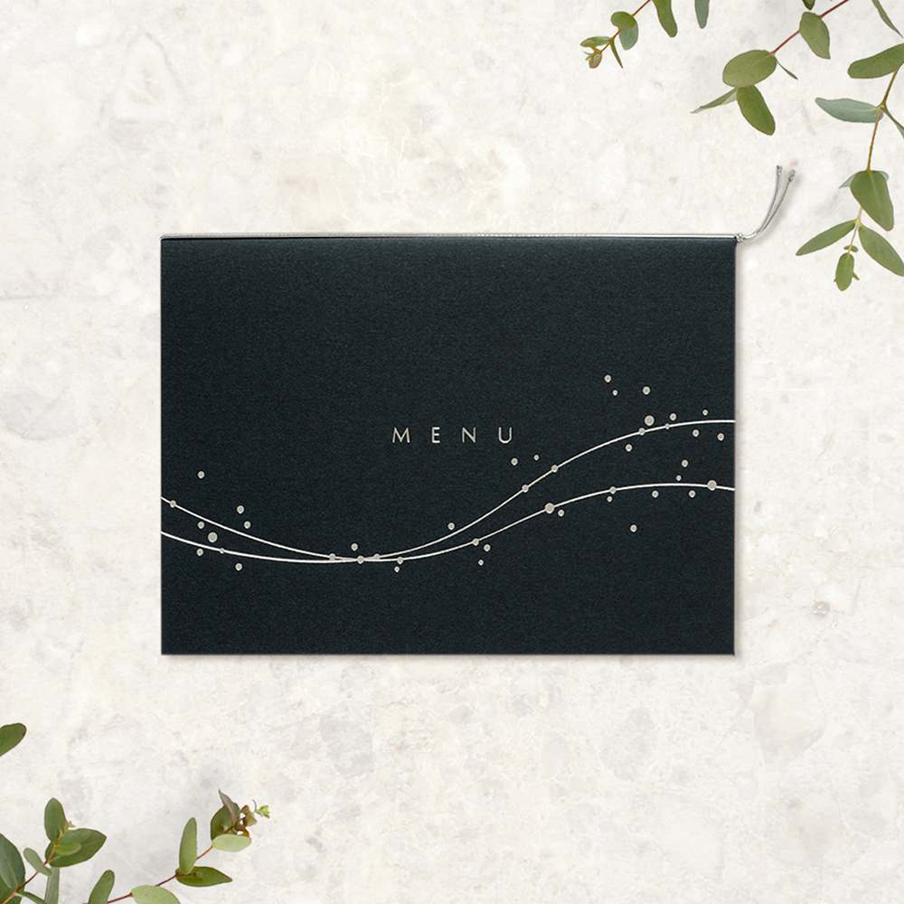 乾杯ではじけるシャンパンの泡のようなデザインを、 シルバーの箔押しであしらいシックにアレンジしました。深みのある濃紺のカバーはテーブルコーディネートにおいてもお花やお料理を引き立ててくれること請け合いです。昼間のご披露宴はもちろんナイトウェディングにもおすすめ。
