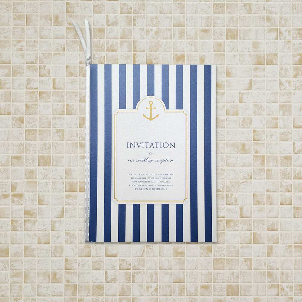 錨のモチーフとネイビーブルーのマリンストライプのデザイン。 落ち着いたフォーマル感のあるマリンウェディングを演出します。