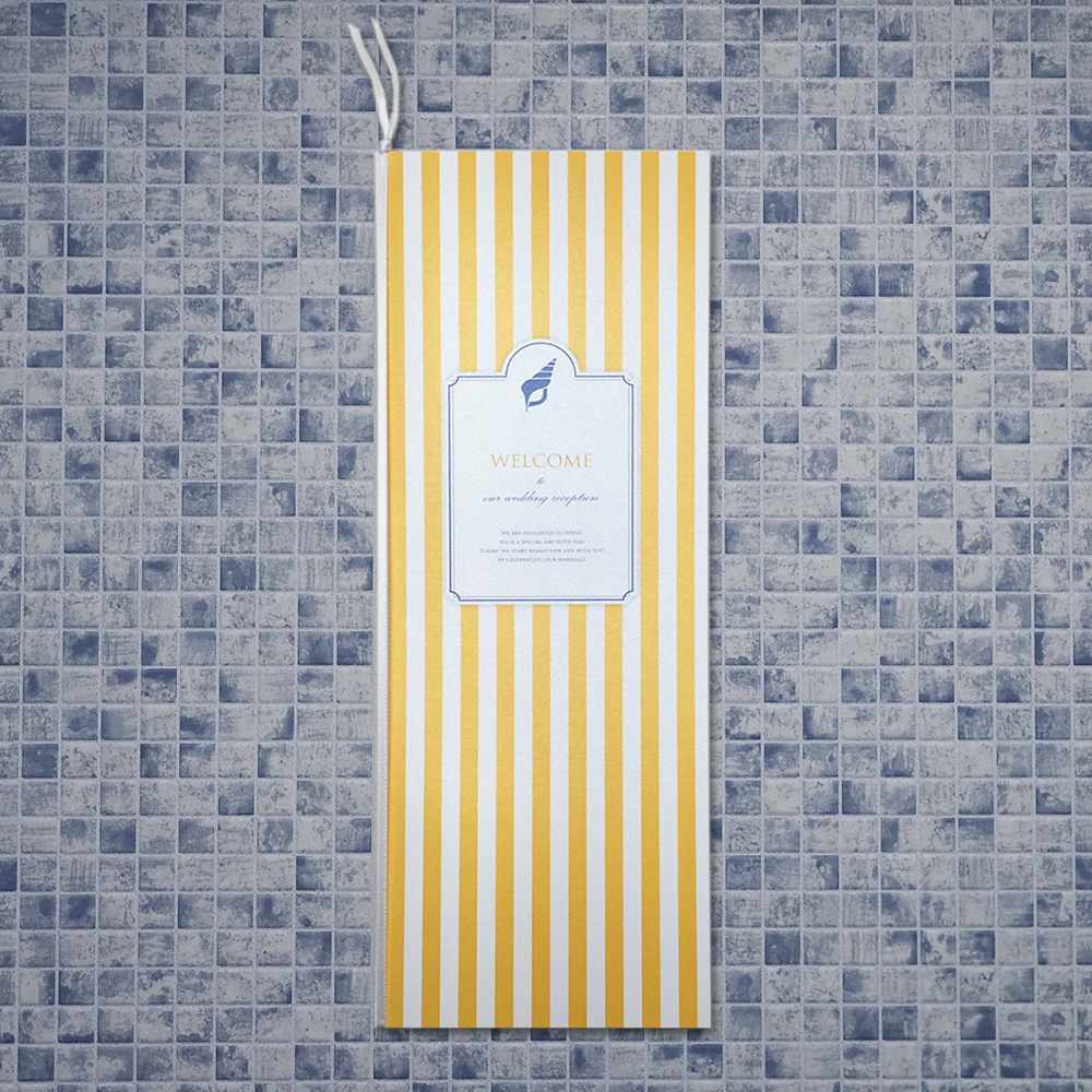 貝殻のモチーフとイエローのマリンストライプのデザイン。 ポップでカジュアルなマリンウェディングを演出します。