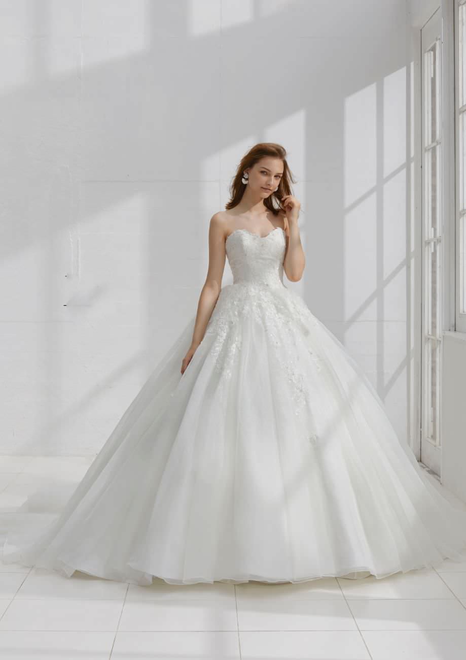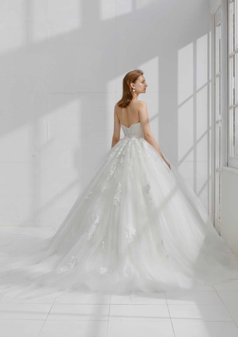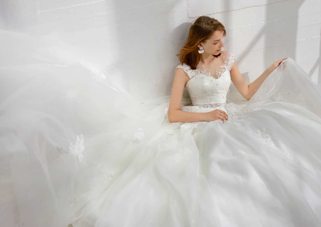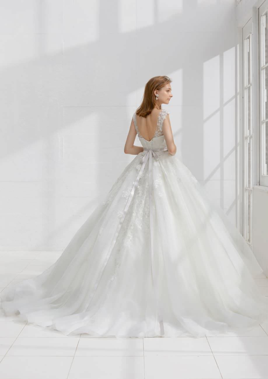 オーガンジーをたっぷり使ったボリュームスカートにグラデーションに流れるような大柄レースが品格ある花嫁を演出します。