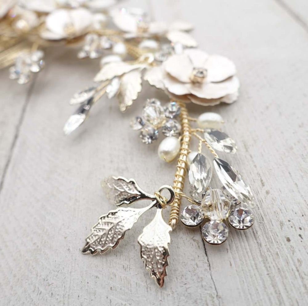 フラワー、贅沢に使用したラインストーン、ゴールドのリーフ。ほんのりビンテージ感漂う中にも、洗練され、とても華やかな印象です。