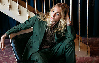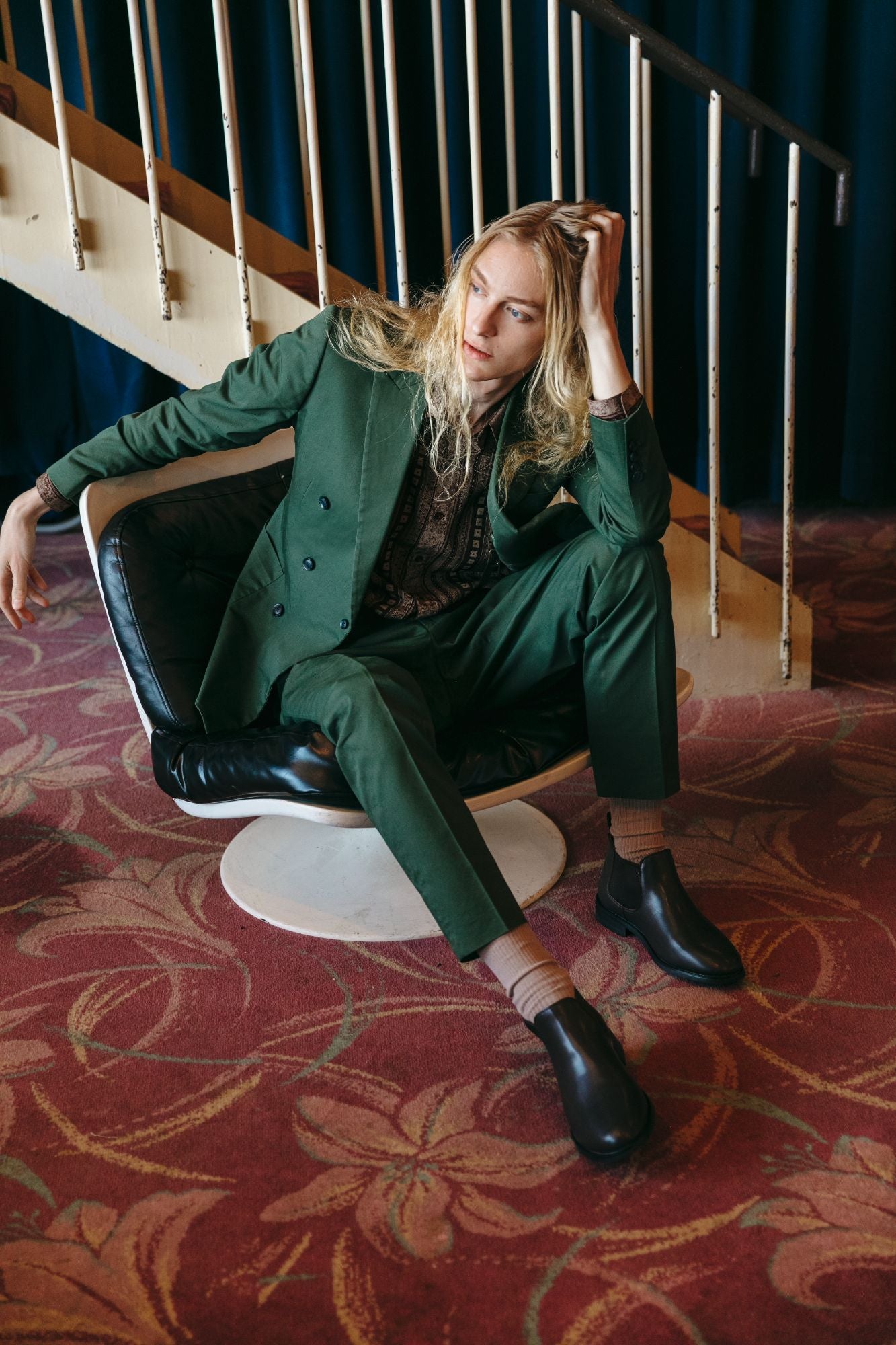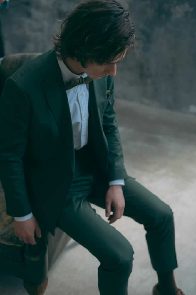 落ち着いたダークグリーンの品格のあるダブルブレスト。フォーマルもカジュアルもシーンを選ばない1着。