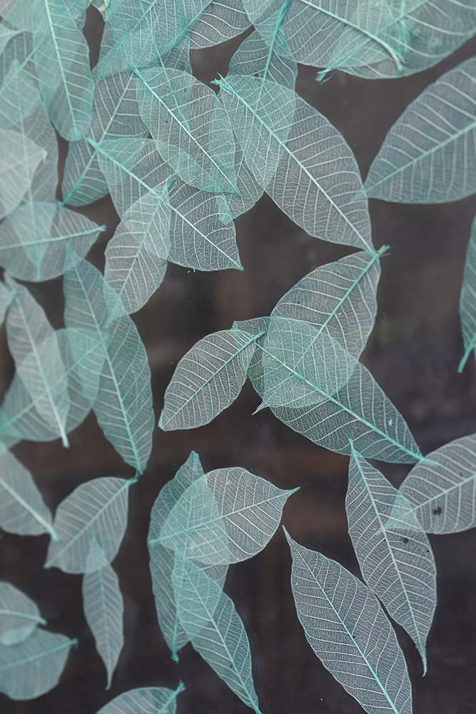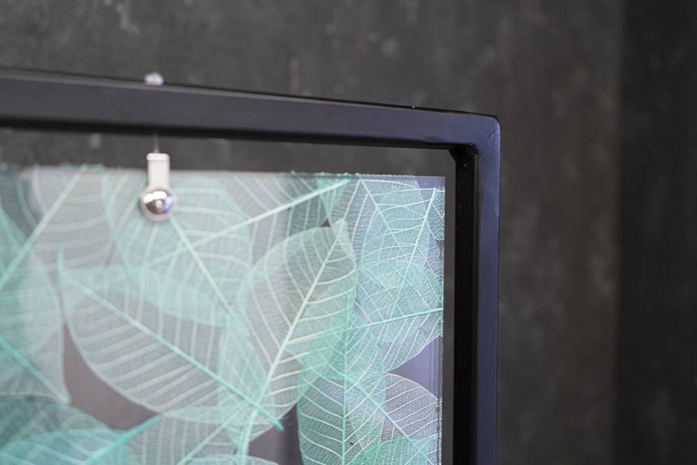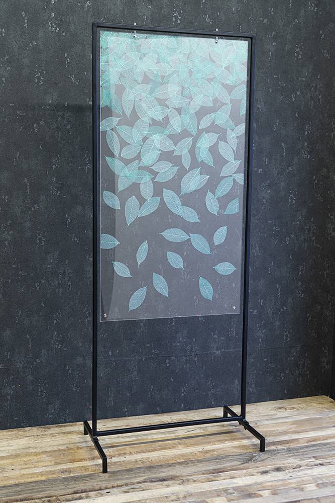 2枚の透明なアクリルパネルに透ける加工をした「スケルトンリーフ」を挟んで装飾し、鉄製の枠に固定したデザイン性の高いパーテーションです。