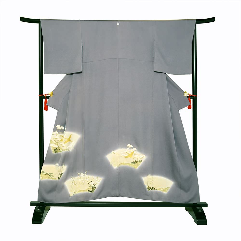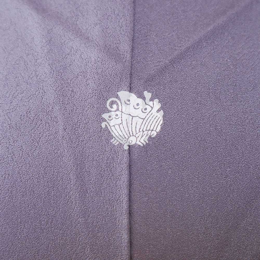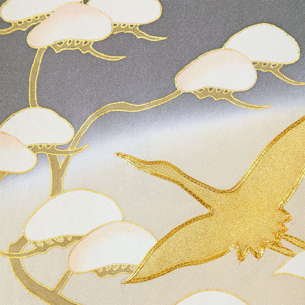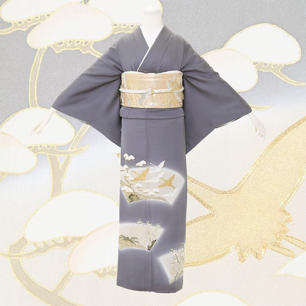 紫苑色を基調とし素色に青海波や光琳松・若松・笹が描かれ、一部金駒刺繍を用いた飛鶴が配された落ち着きのある一枚。茗荷蝶の一ッ紋入り。