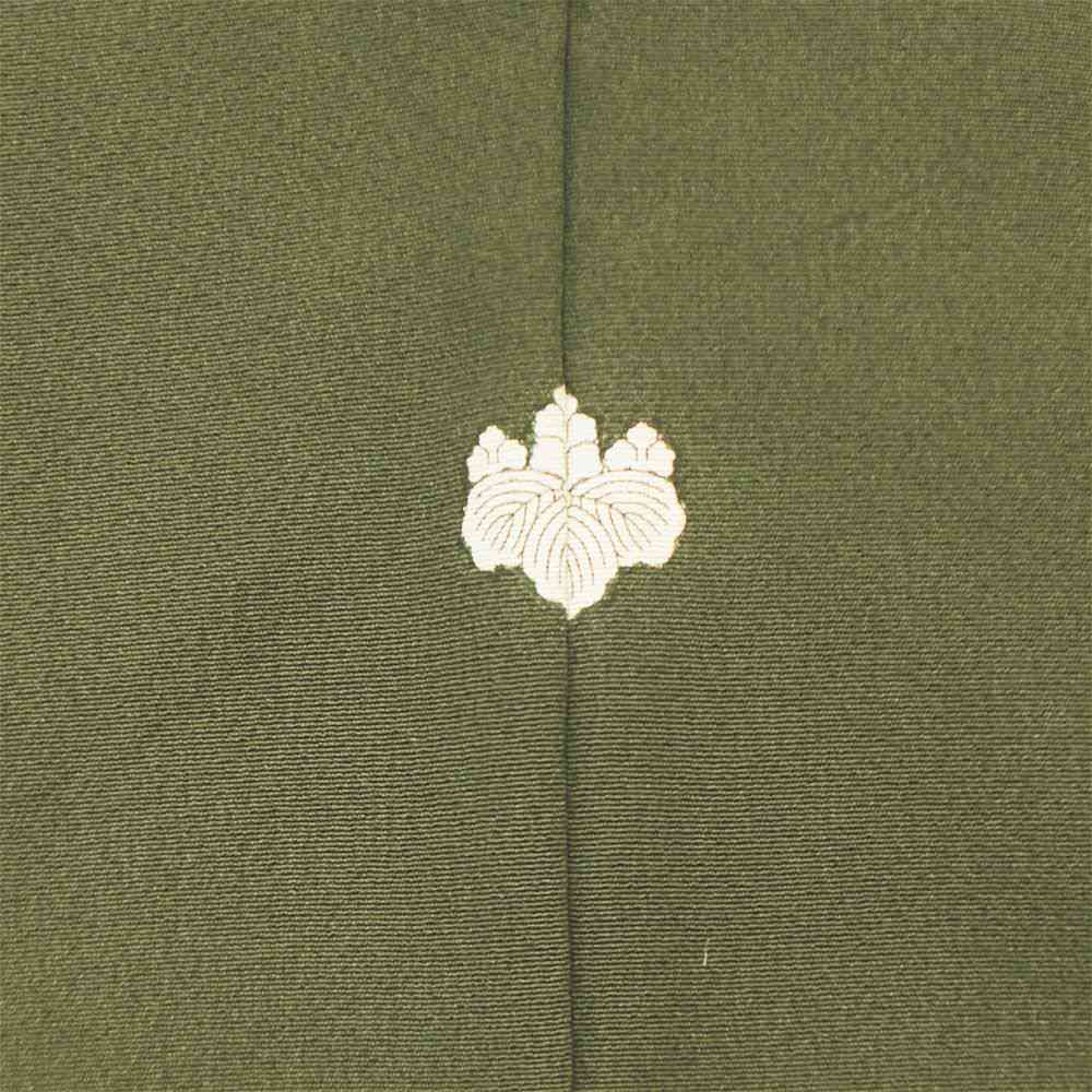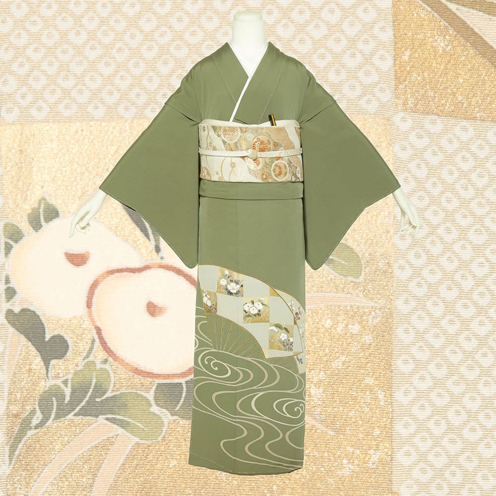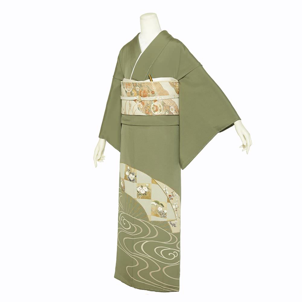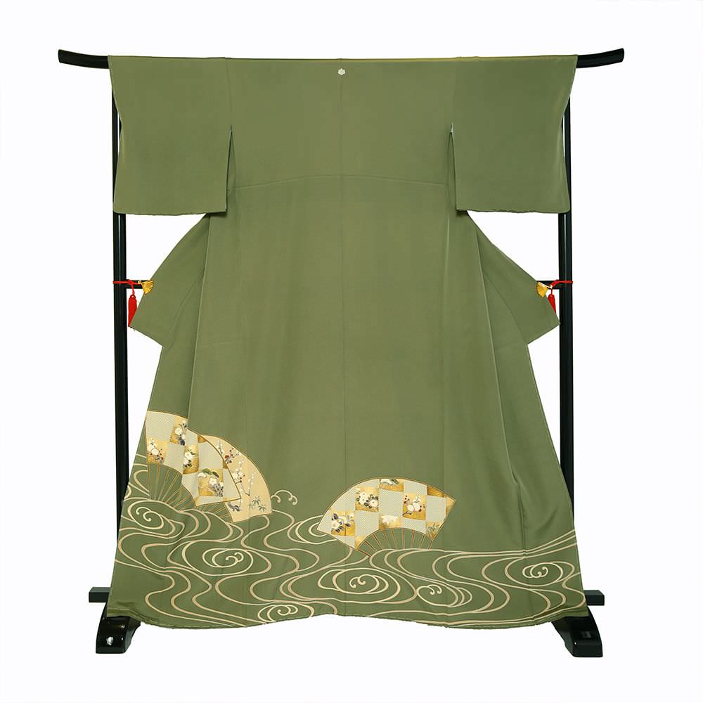 海松(ミル)色を基調とし、疋田染めや四季草花をあしらった扇流しが描かれた落ち着きのある一枚。五三の桐の一ッ紋入り。