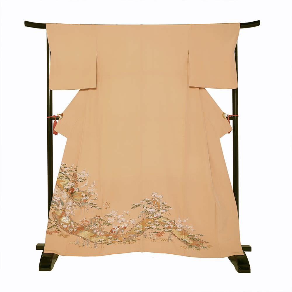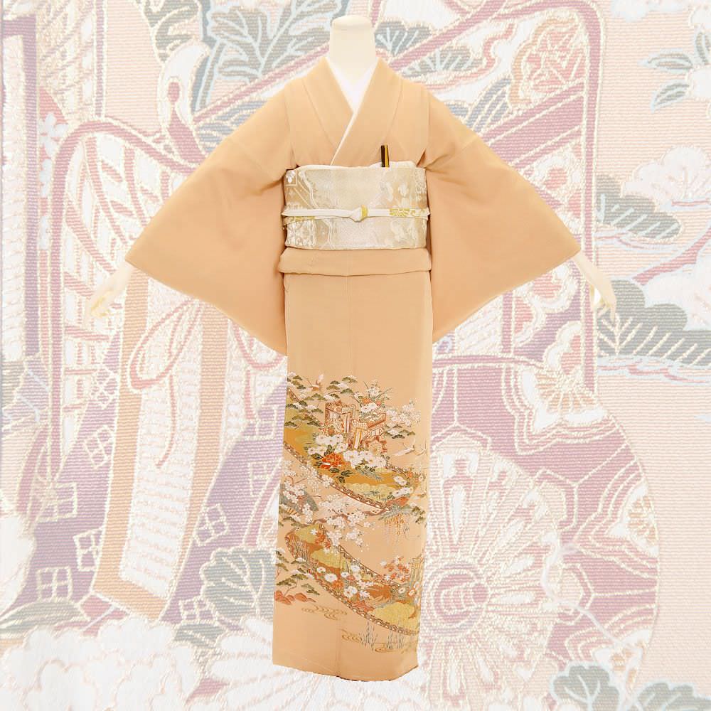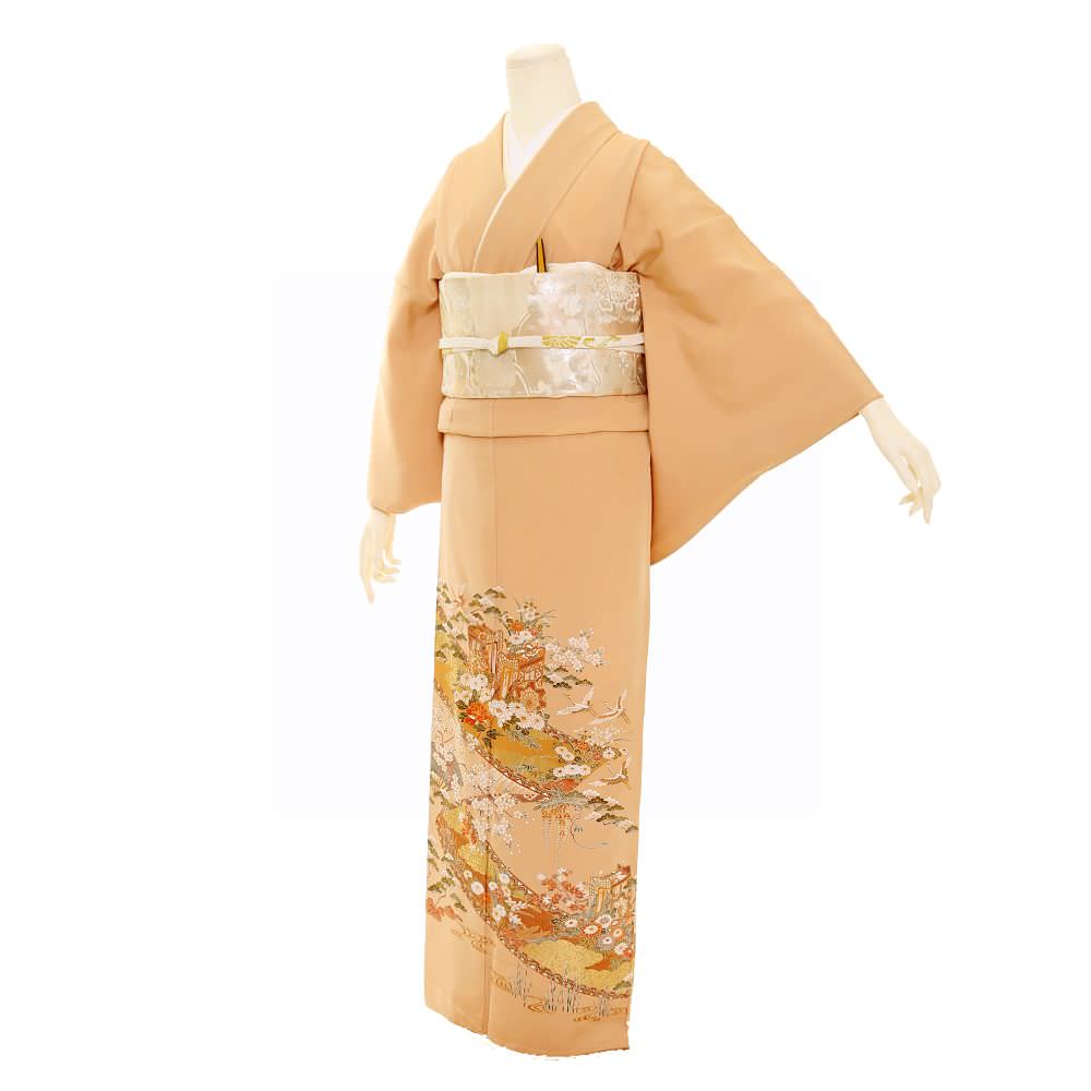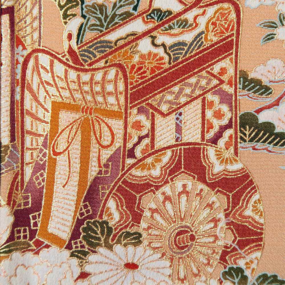淡香(ウスコウ)を基調とし、御所車や流水、桜・松・菊・紅葉など様々な四季草花があしらわれ、飛鶴も描かれた上品な一枚。
