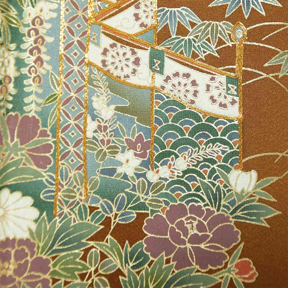 芝草に牡丹や杜若などの四季花と松や紅葉などの木々をあしらい、屏風を配した古典的な一枚。