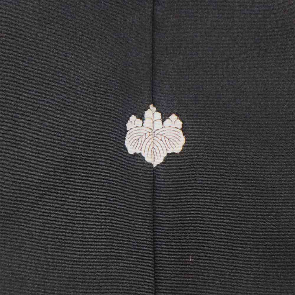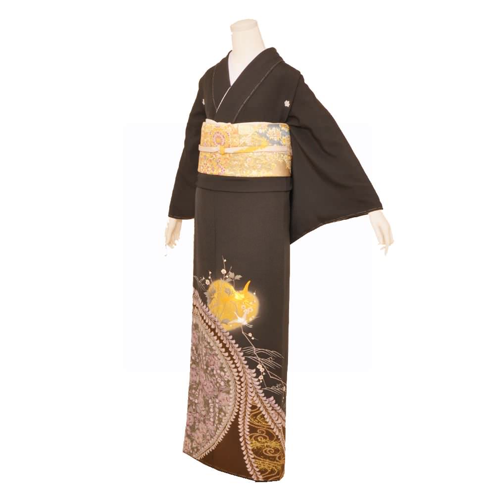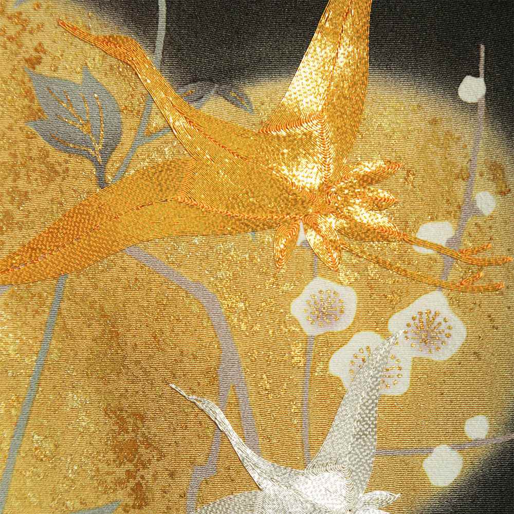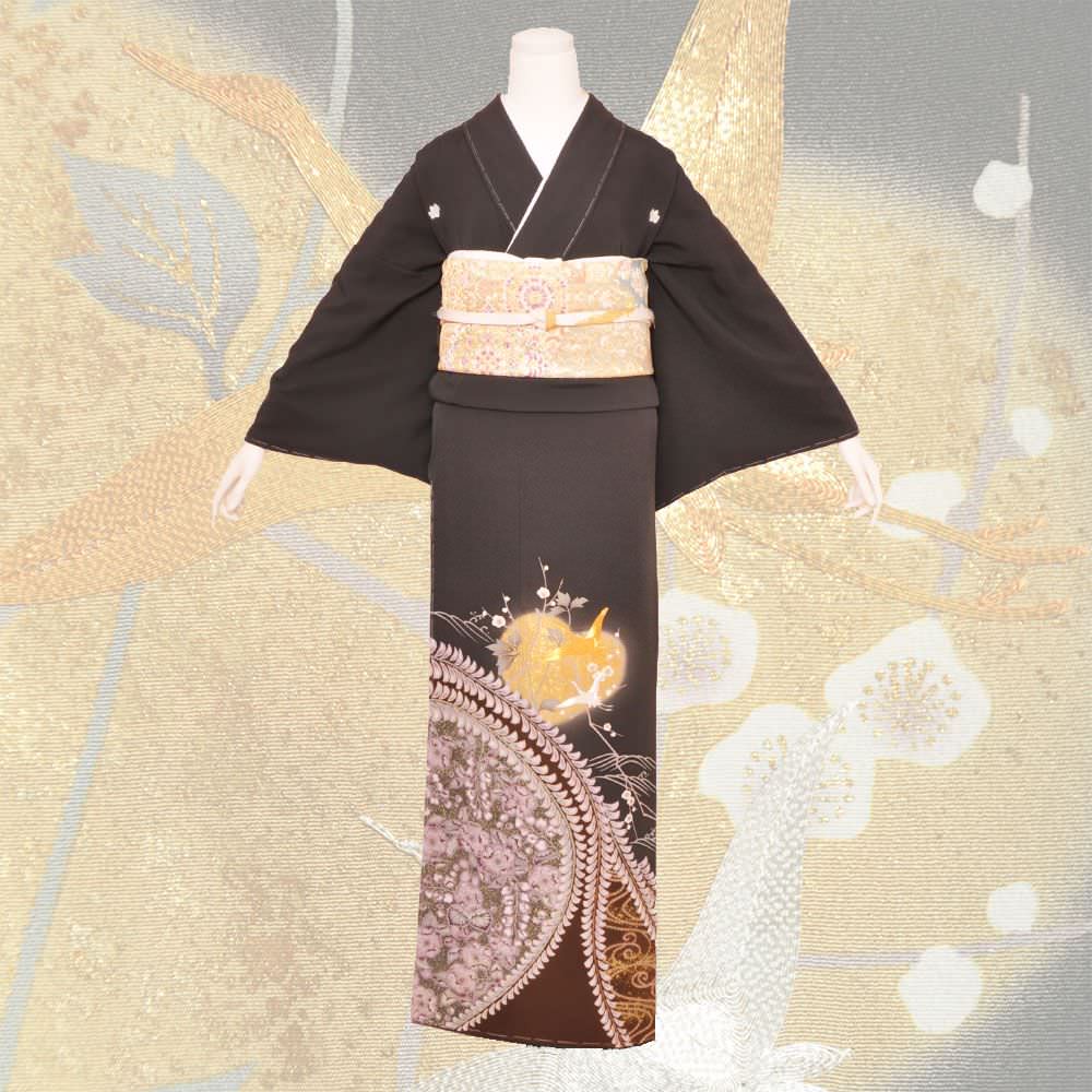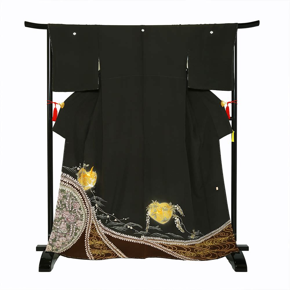 作家物の一品。黒緑色を基調とし、藤の花で染め分けされた憲法黒茶色のぼかし入り。ぼかし内には、辻が花や波文が描かれ、その外には金駒刺繍を用い描かれた飛鶴があしらわれた落ち着きのある一枚。五三の桐の五ッ紋入り。