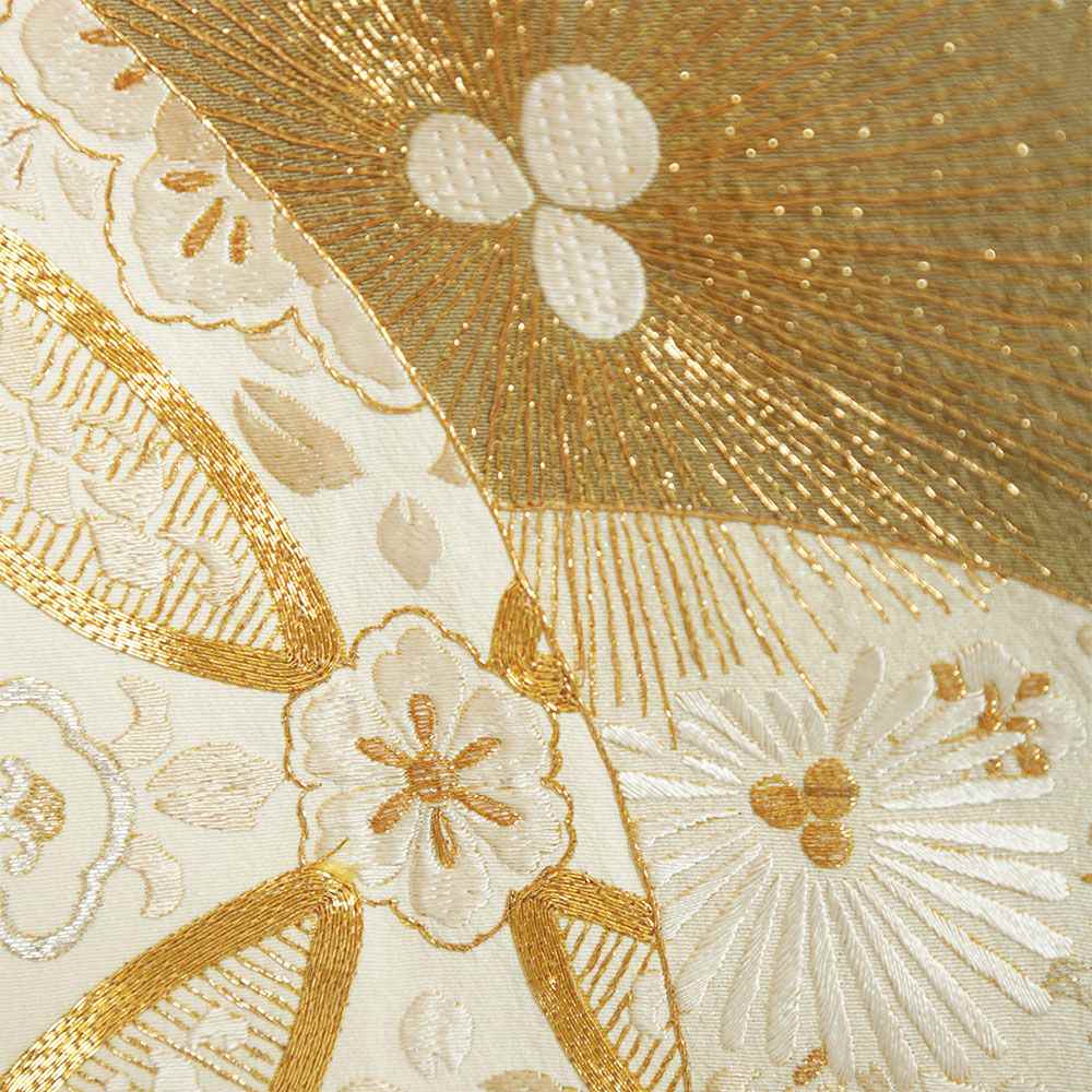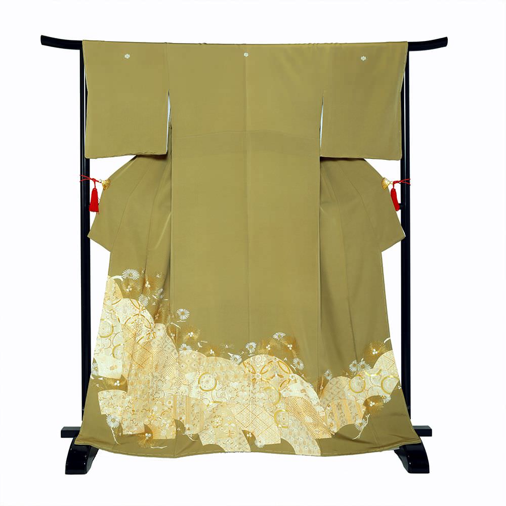 朽葉(クチバ)色を基調とし、蘇州(ソシュウ)刺繍を用い吉祥文様を施した地紙の周りに、 松があしらわれた華やかかつ豪華な一枚。五三の桐の五ッ紋入り。