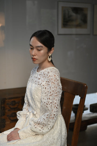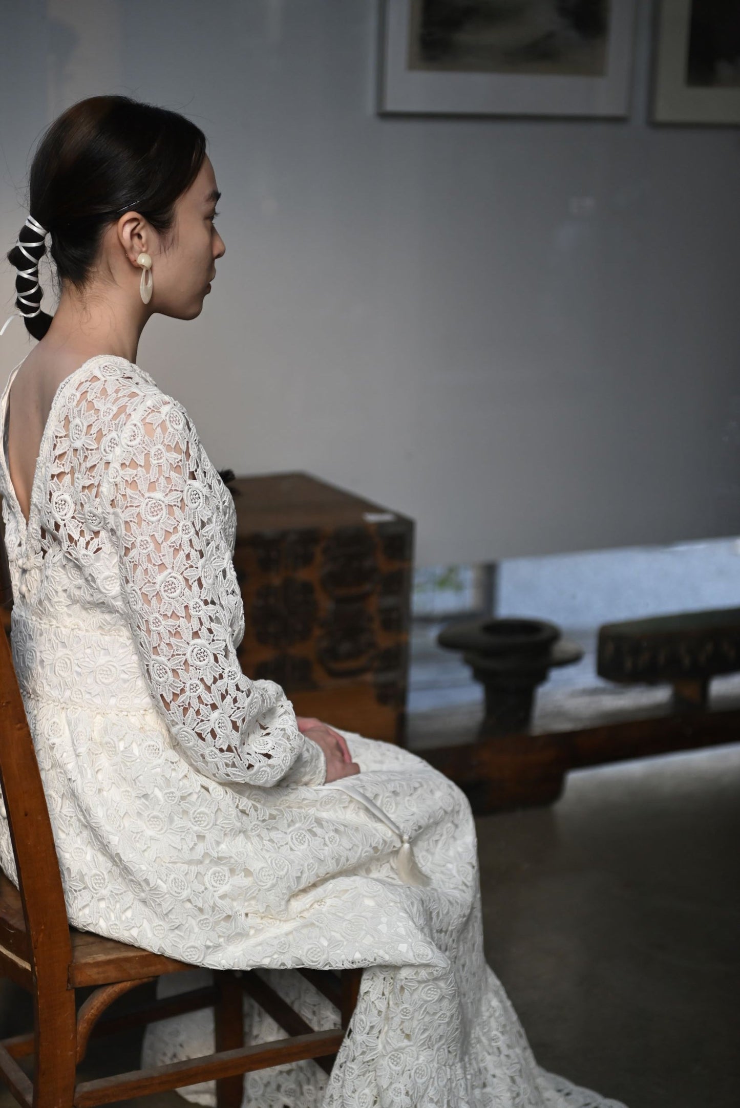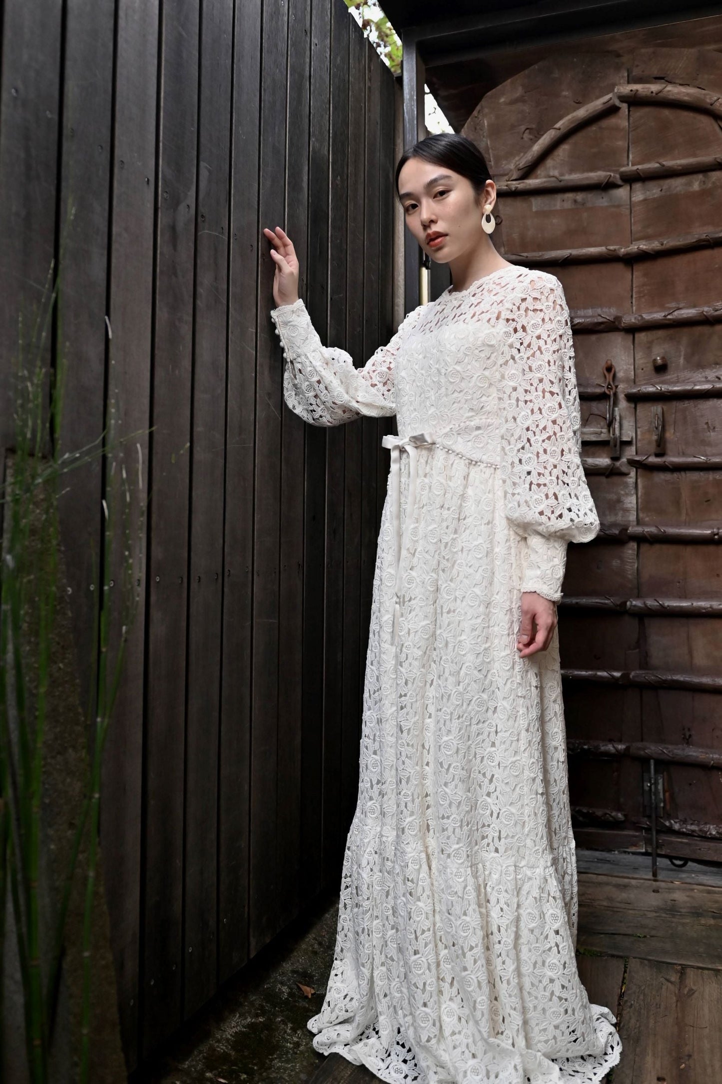 総レースの華やかさに、スレンダーなシルエットとコットン100%の素材感のナチュラルさを併せ持ったドレスです。