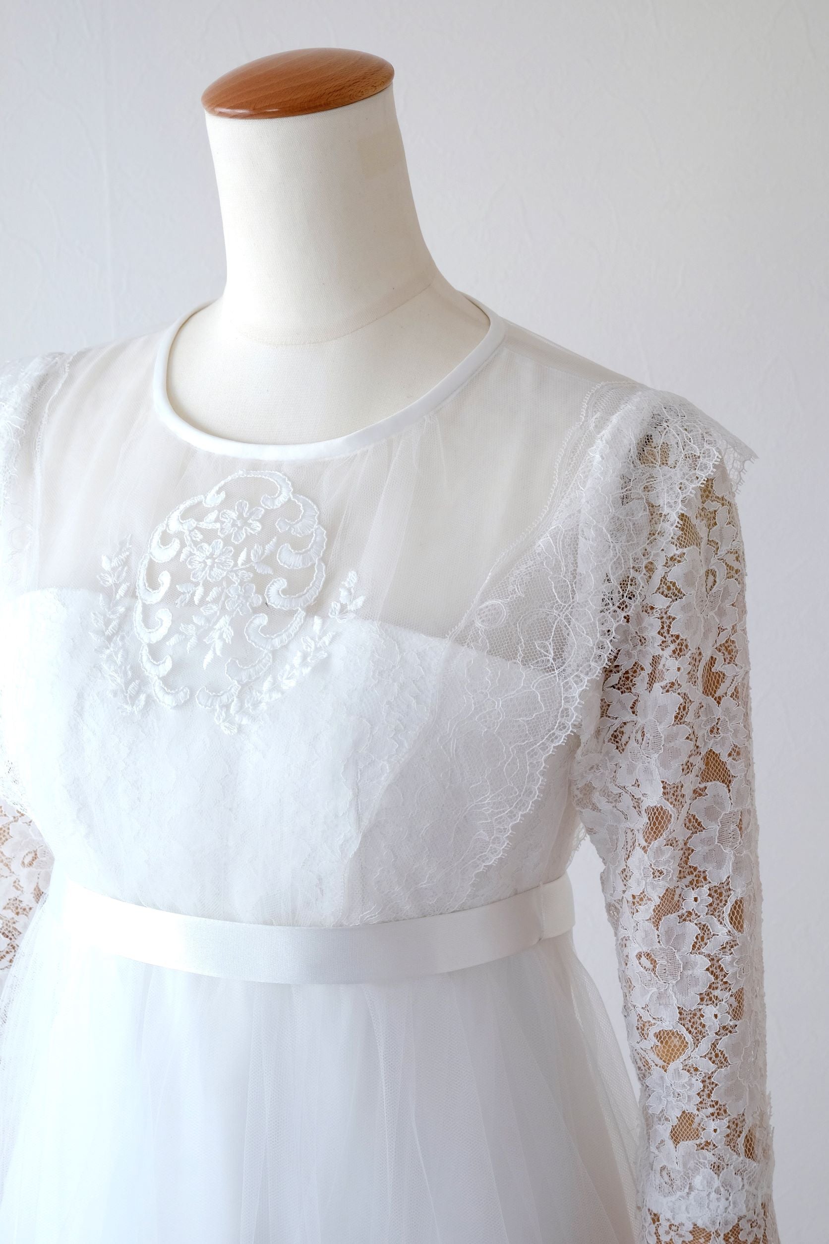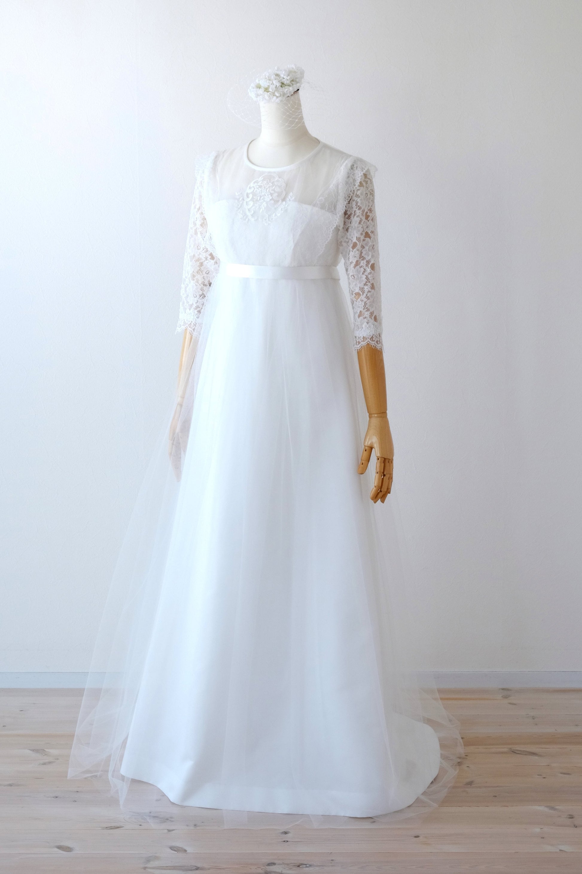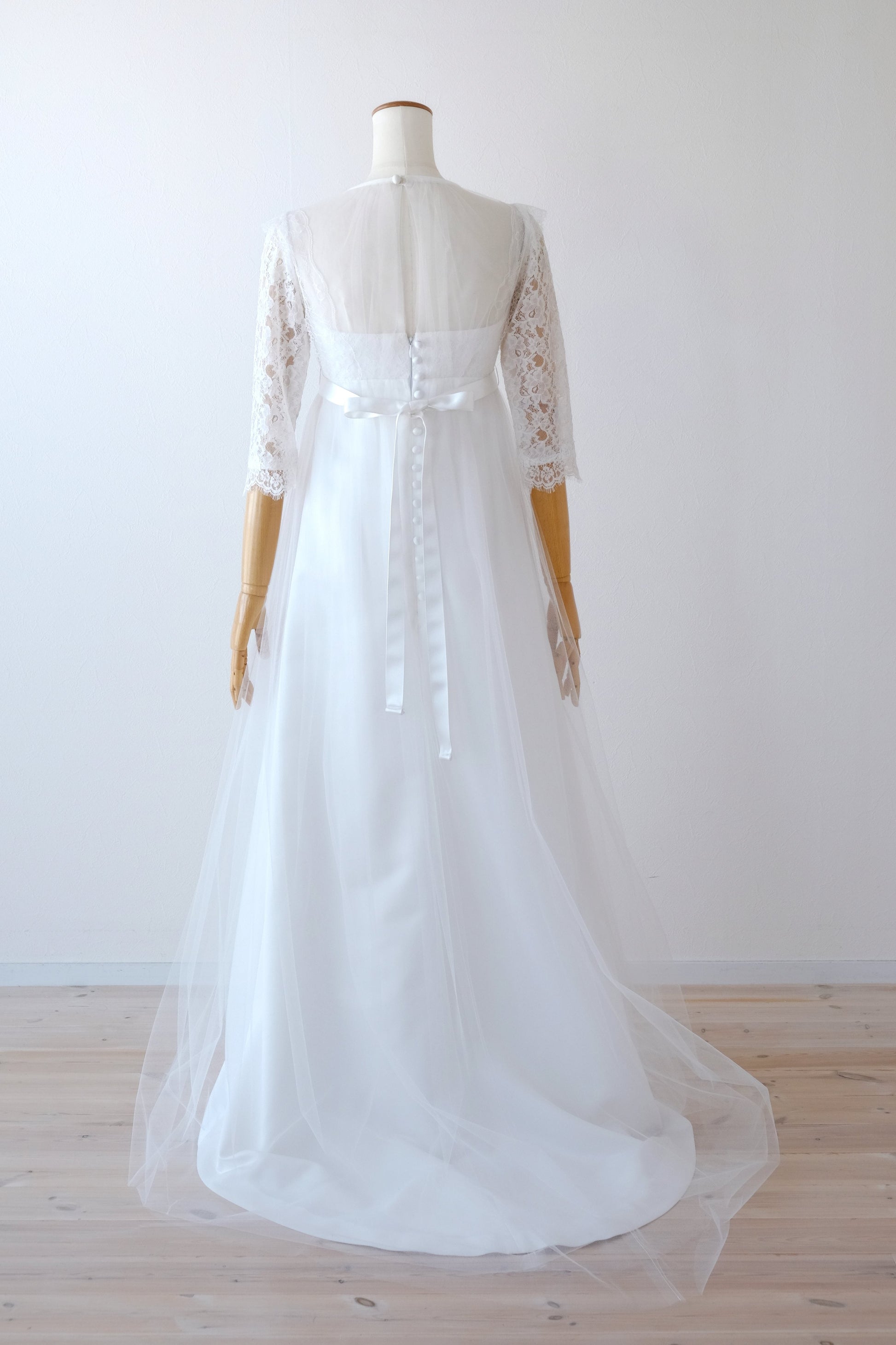 チュールのドレープの下には、レースが優しく見え隠れするエンパイアドレス
