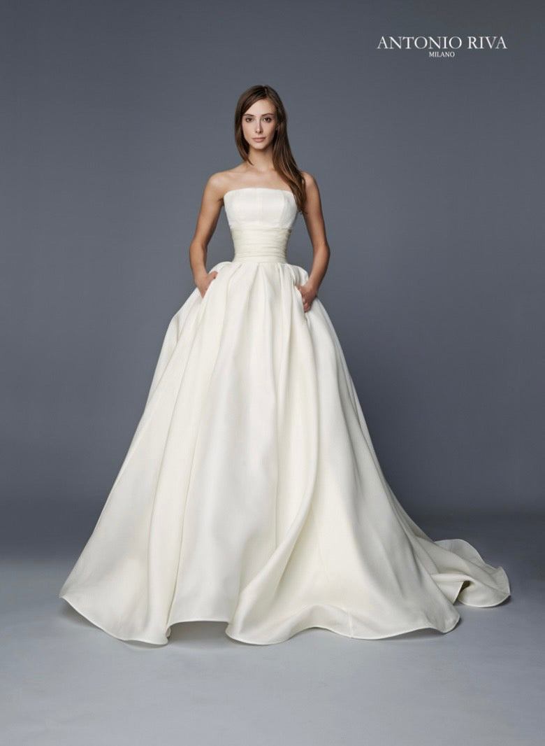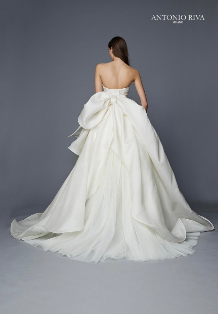 アントニオリーヴァの代表的なドレスでひときわ人気の高いドレス。シルクがガザルの持つ独特なハリ感から生まれるリボンモチーフのトレーンの流れが構築的で心奪われる一着。ボリューム感のあるプリンセスラインとバックリボンモチーフのフェミニンさのなかにも、個性的なガザルの素材感とトレーンのプリーツ加工がスタイリッシュな着こなしを叶えてくれます。