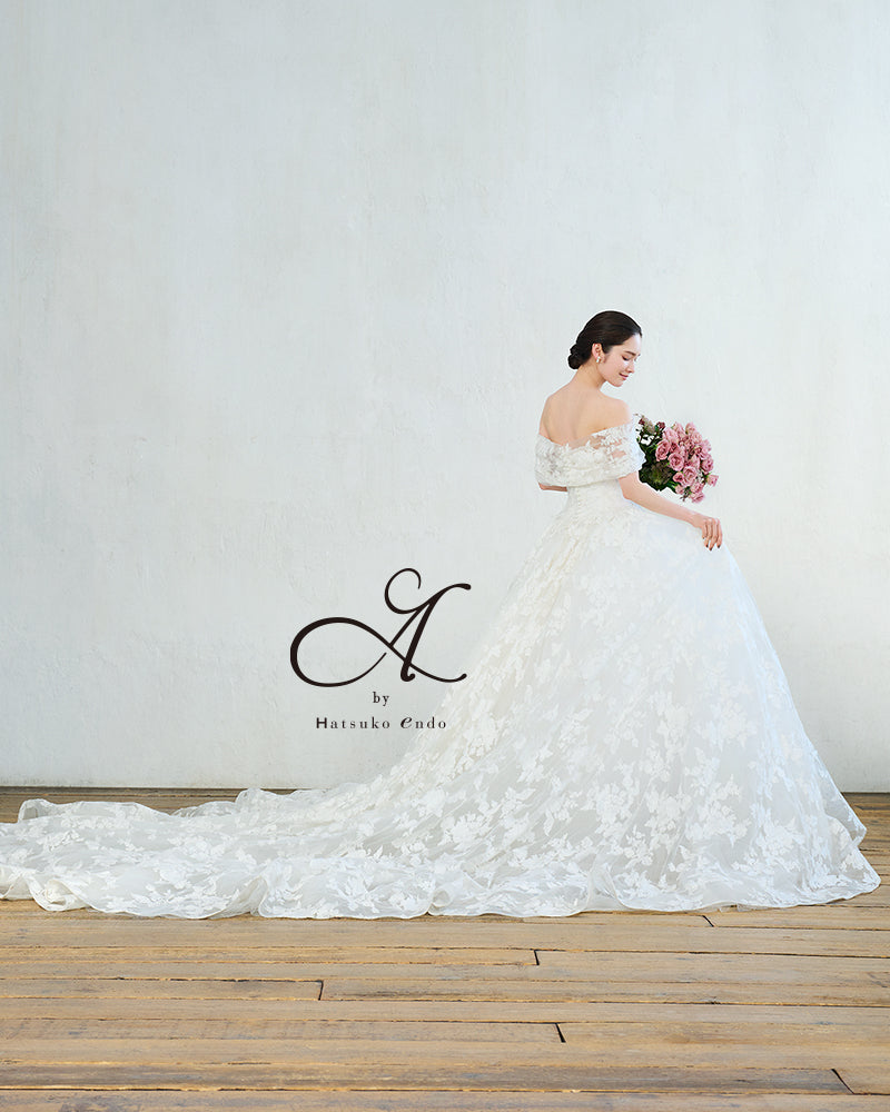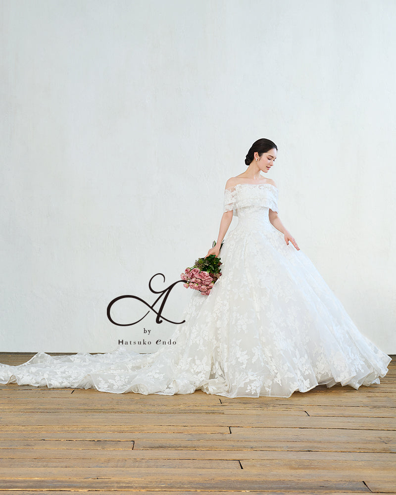 繊細なフラワーレースを贅沢に使用した総レースドレス。総レースならではの豪華さと透明感のあるシルエットがエレガント。ボリュームのあるふんわりとしたスカートとレースのケープが優しい印象に。