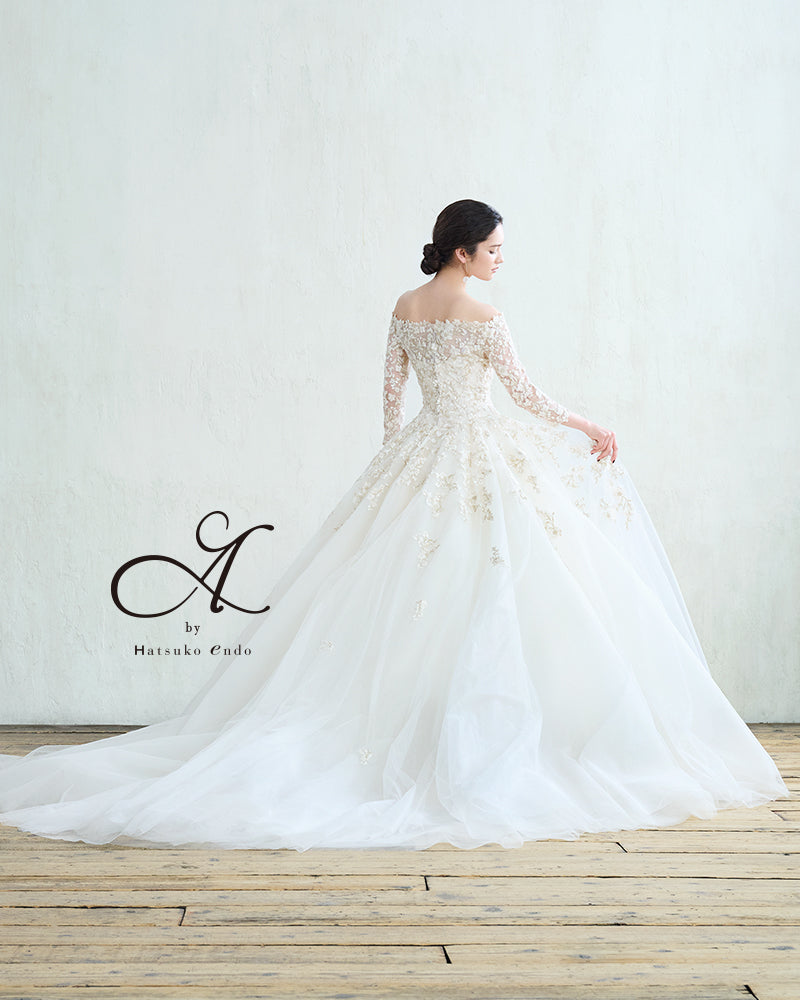 ゴールド糸の入った小花が散りばめられたオフショルダーのドレス。小花を一つずつ配置し、繊細に仕上げされた一着。スカートの大きく立体的なフレアがロマンチックな雰囲気。