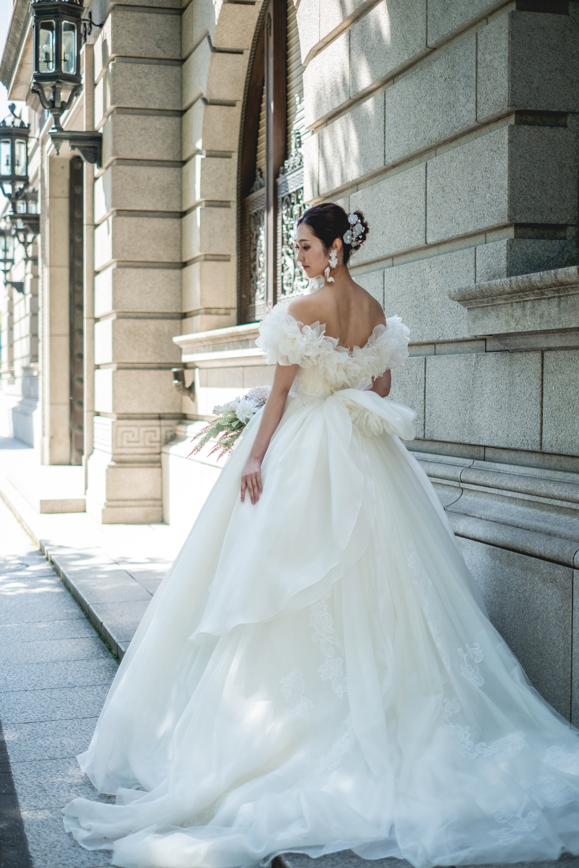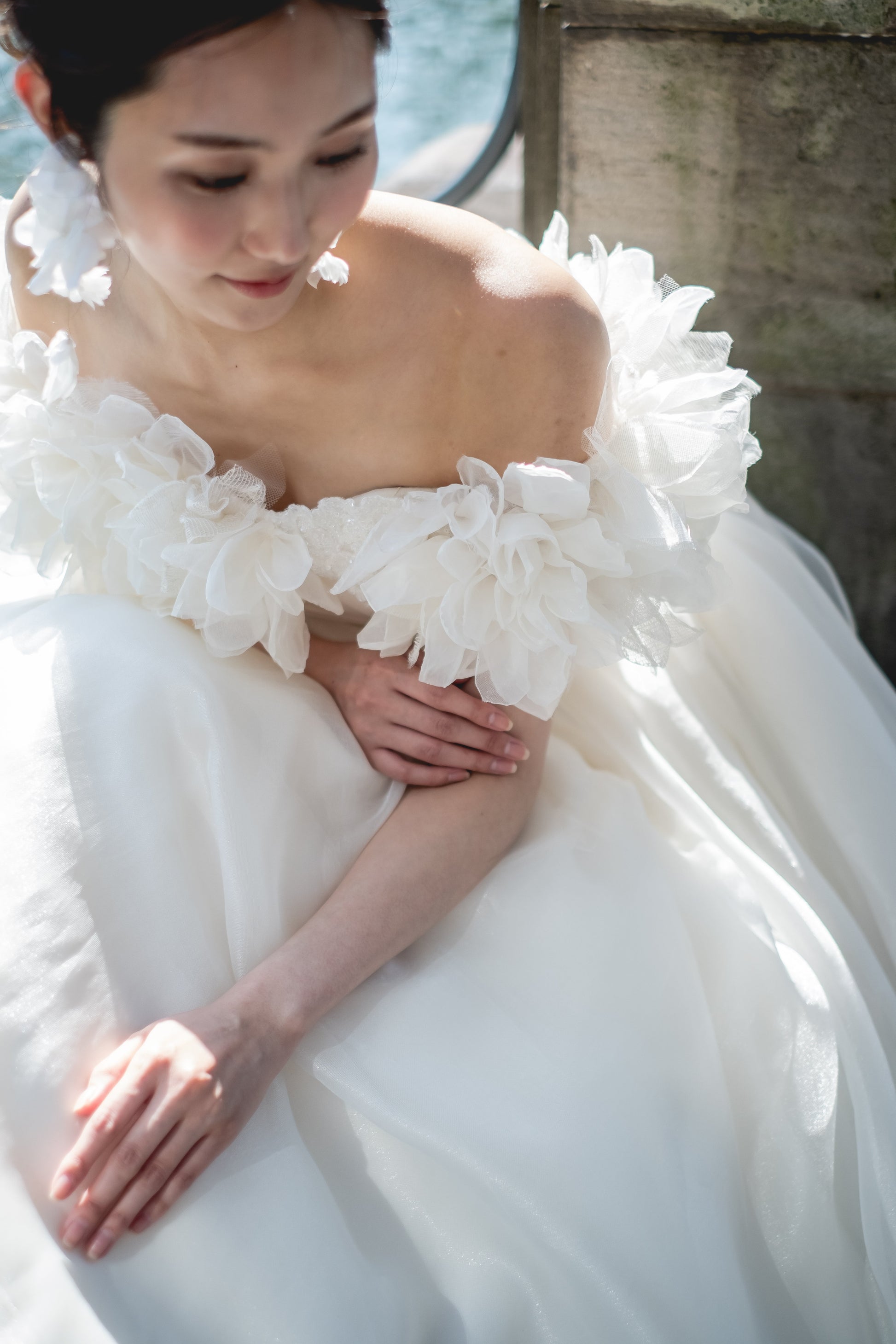 軽やかなガザールの素材にたっぷりとフレアーを入れたスカート。タックを取ったトップスには光り輝くビージングリバーレースをアレンジして豪華さを。アシメトリーなバックの大きなリボン足部分にはエアリーなコードレースをアップリケして印象的なバックスタイルを。取り外し可能のフラワーケープを纏うと、更に華やかでキュートな印象です。