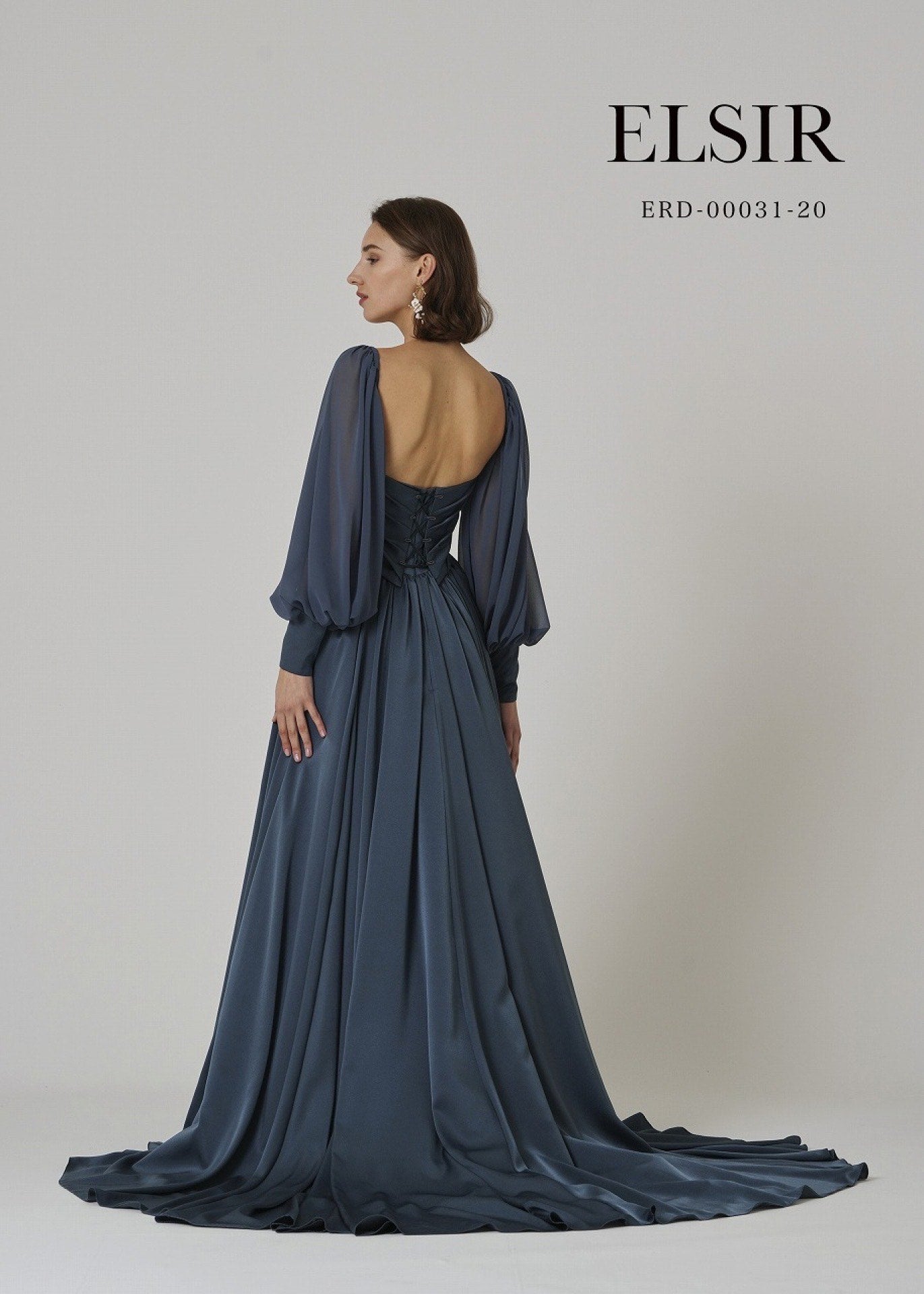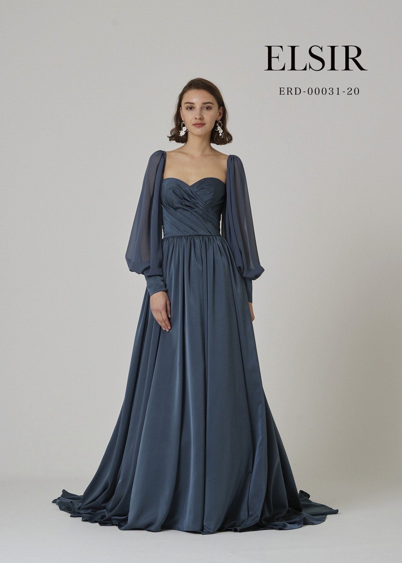 デコルテラインが美しく見えるハートネックとボリューム感がありつつトロンとした質感が印象的なランタンスリーブがポイントのドレス。長めのカフスでメリハリを出しています。オフショルダーにもでき、取り外しもできる3WAY使用でそれぞれ雰囲気が全く異なるため、花嫁様のお好みのスタイルにチェンジも可能です。