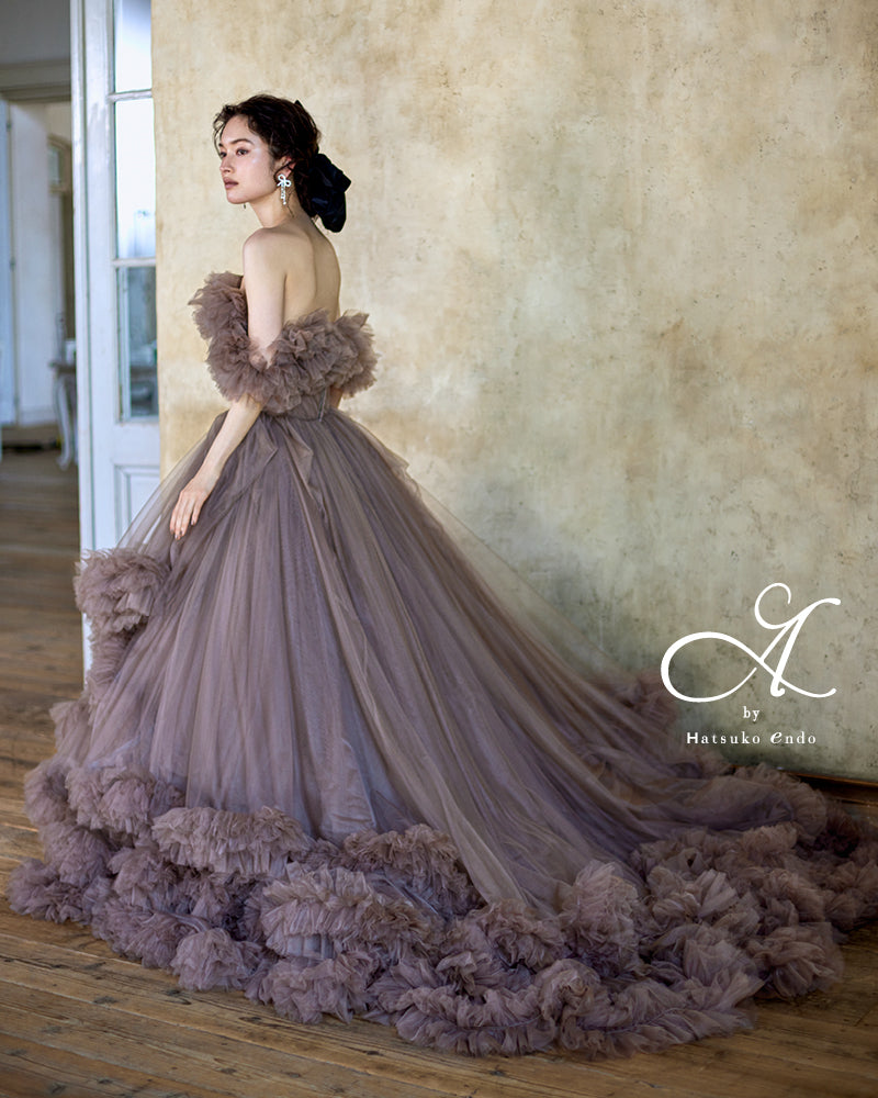 オフショルダーとスカートのモコモコが特徴。ランダムに揺れる段々のスカートが目を惹くドレスです。