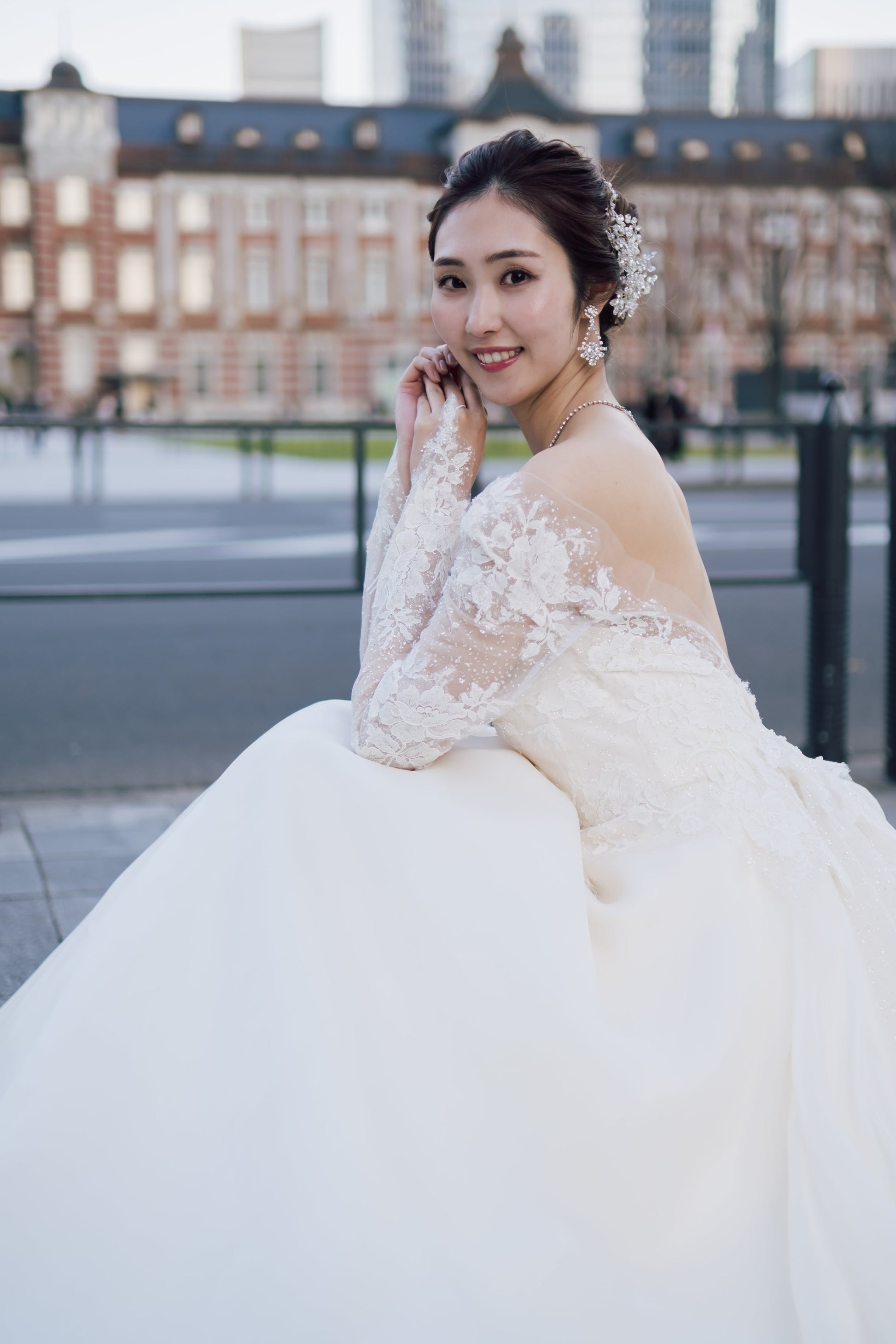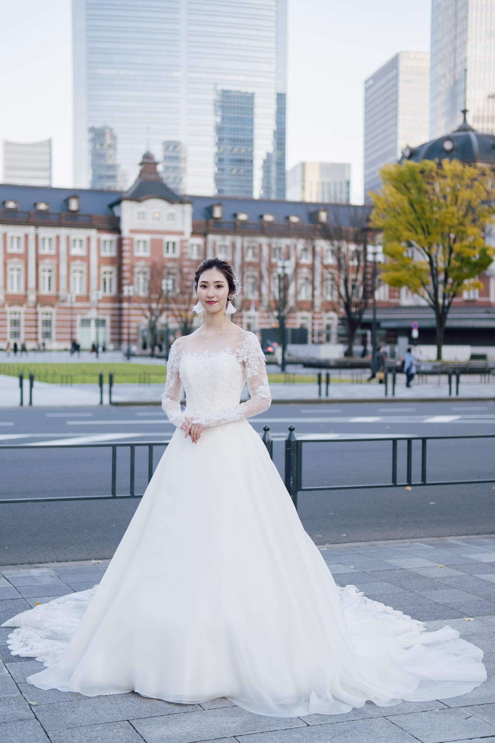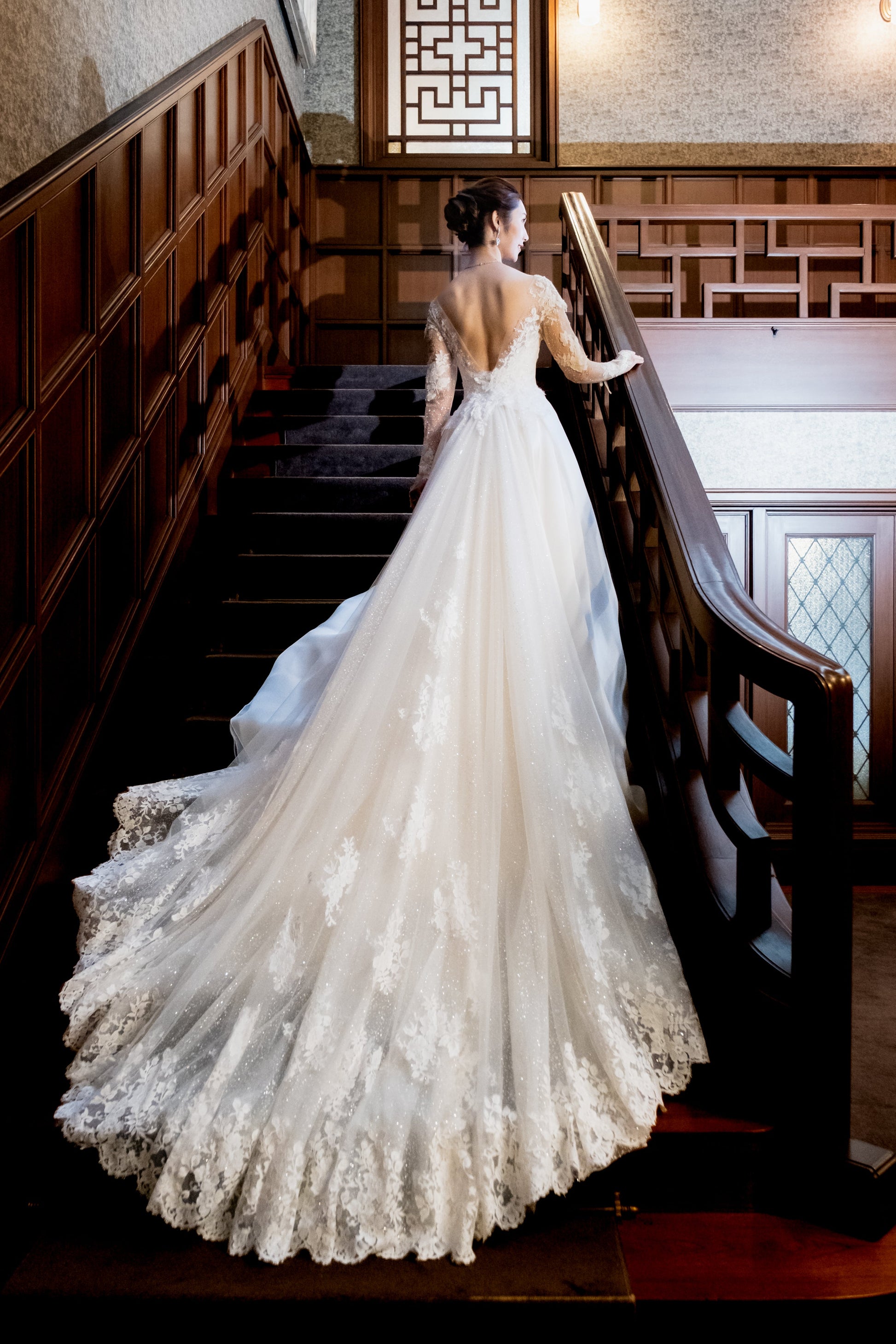 軽やかで光沢感の美しいシルクサテンオーガンジーのマリエ。ベースのスカートは小さめのAラインにして、取り 外しのバックトレーンには光り輝く伊製チュールグリッターをアンダーに、仏製リバーレースを裾に一周、更に立ち 上がるように柄を描いてゴージャスなバックスタイルに。トップスは半袖にガントレット風の長袖が取り 外し可能。4WAYでのデザインを楽しむ事が出来ます。