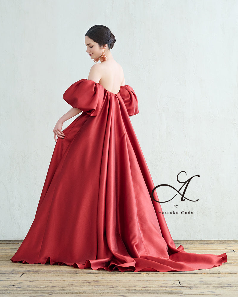 シンプルながらミカドの美しい光沢感とバックスタイルの流れるようなデザインが特徴のドレス。パフスリーブは取り外しができるので、お好みでセレクトしていただけます。