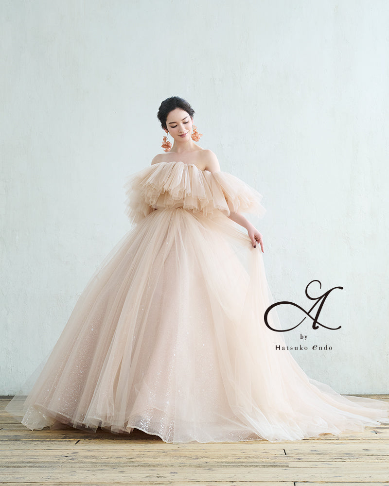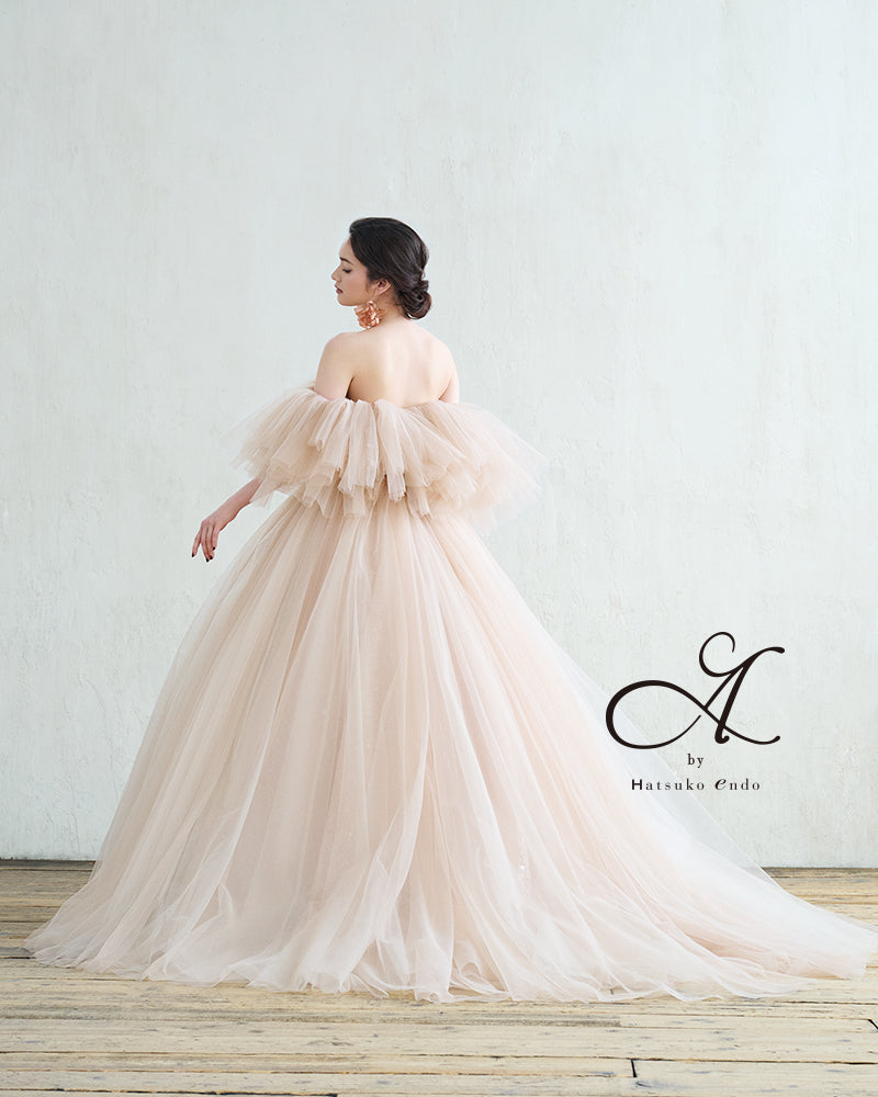 ボリューミーなオフショルダーケープが特徴。チュールにふんわり包み込まれているようなイメージの一着。スカートから覗くシークインチュール(スパンチュール)の光沢が美しいデザイン。