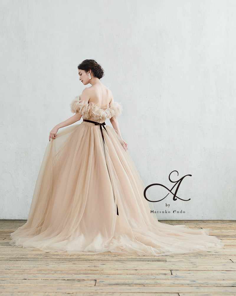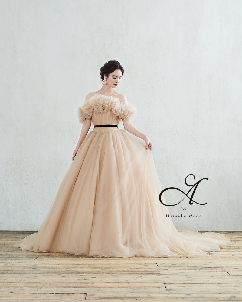 プリーツ加工を施したトップスに、肩のラインを美しく見せるチュールのオフショルダーが印象的なデザイン。ベージュやブラウンなど、注目のカラーも魅力のフォトジェニックな一着。