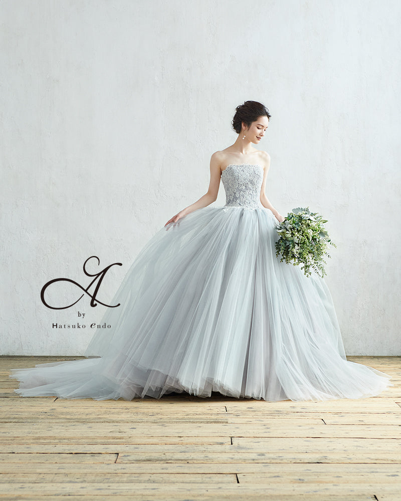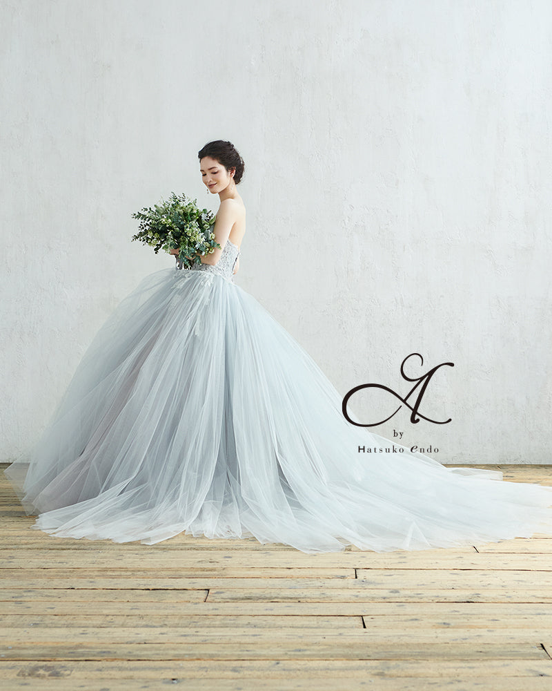 アイボリーレースとニュアンスカラーのスカートの組み合わせが上品なデザイン。レースはフランス製のリバーレースを使用し、数種類のチュールを幾重にも重ねて完成された奥行きのあるエアリーなスカートラインが魅力的。