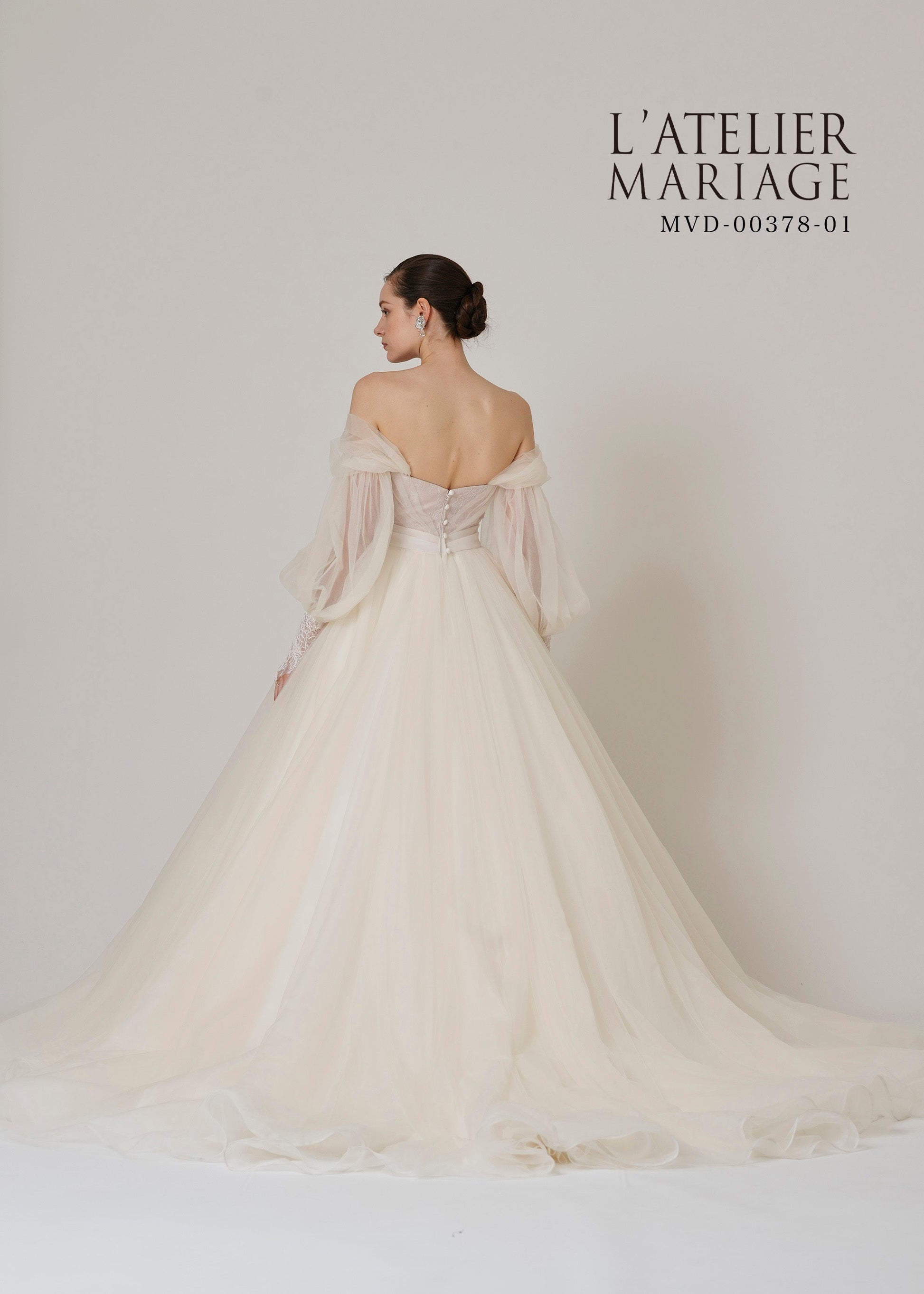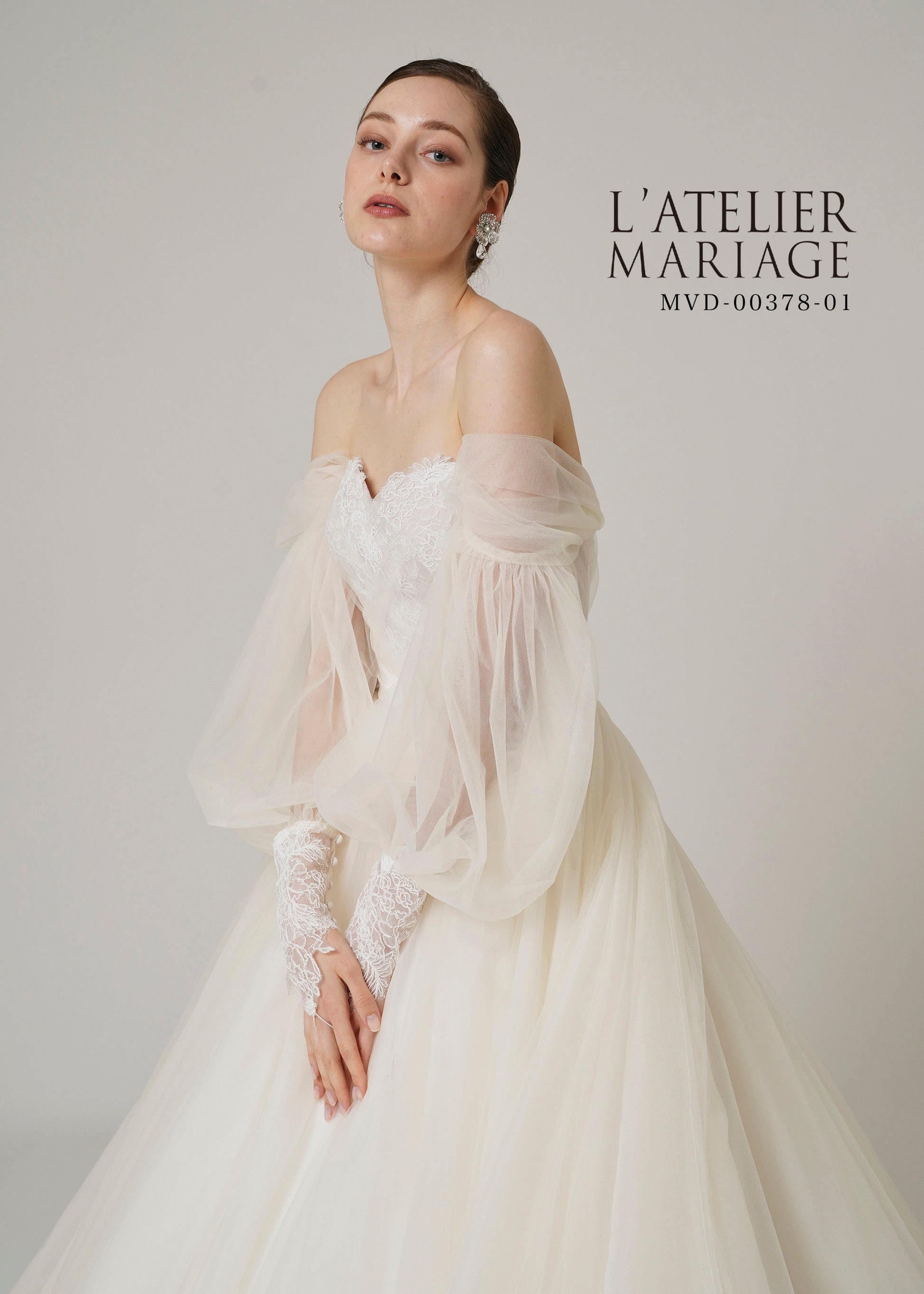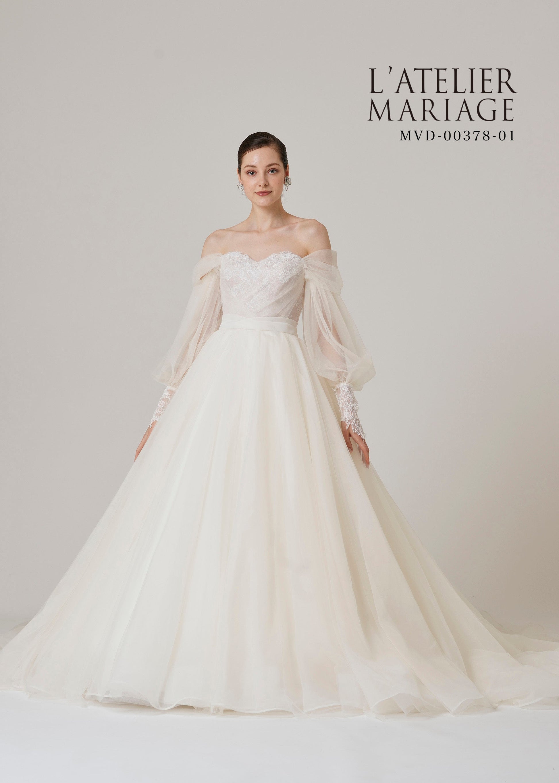 オフショルダーのパフスリーブが印象的な1着。身頃はコードリバーレースとシャンテリーレースを組み合わせた繊 細なディテールになっています。たっぷりとしたビッグAラインスカートがXシルエットをつくり、スタイル良く全体のバ ランスを整えます。パフスリーブを取り外すと、オフショルダースタイルにチェンジします。