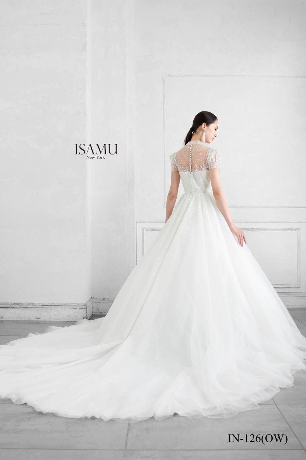 流れるようなビージング加工とグリッターが星空のように煌めくウェディングドレス。スタンドカラーにふんわりしたパフスリーブの組み合わせはどこか高貴でもあり、ロマンティックで愛らしい花嫁様を演出します。