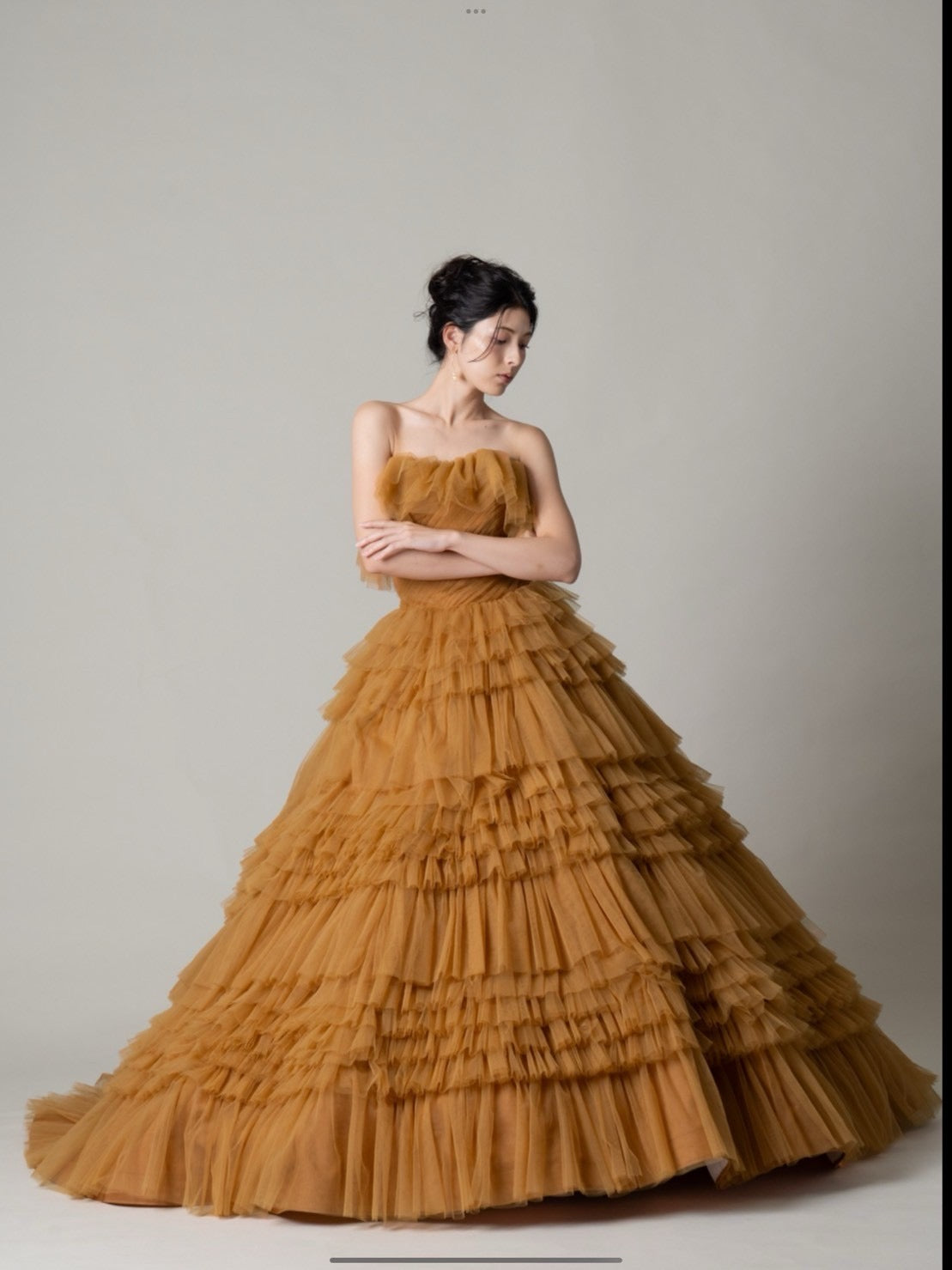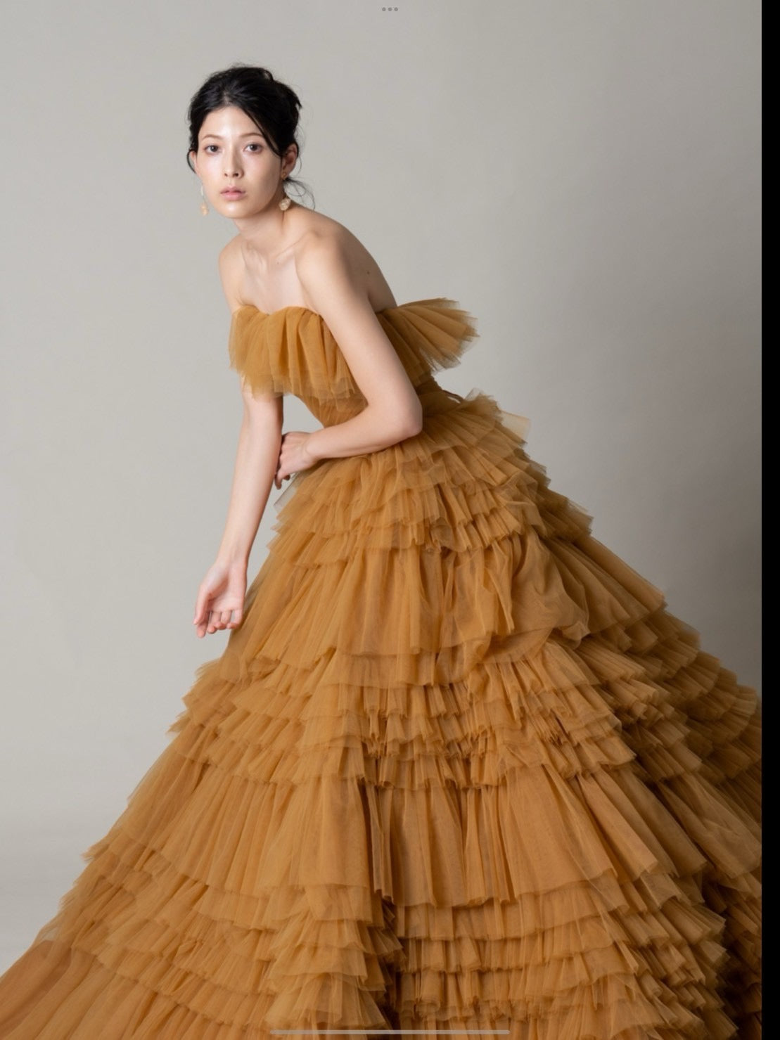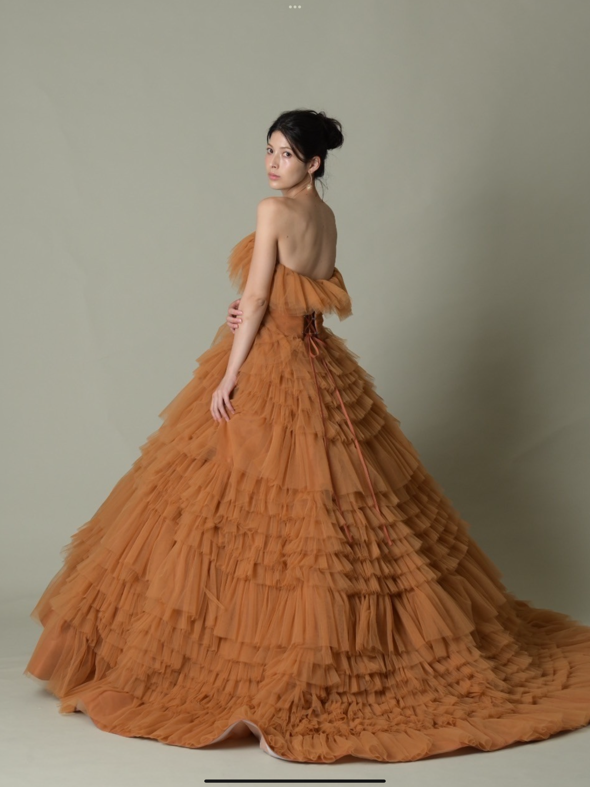 ソフトチュールを幾層にも重ねたトレンド溢れるティアードドレス。ボリューム感を保たせながらスタイリッシュな雰囲気に仕上げ、オリジナルカラーに染め上げたデザートオレンジはファッションシーンでのトレンドカラーです。