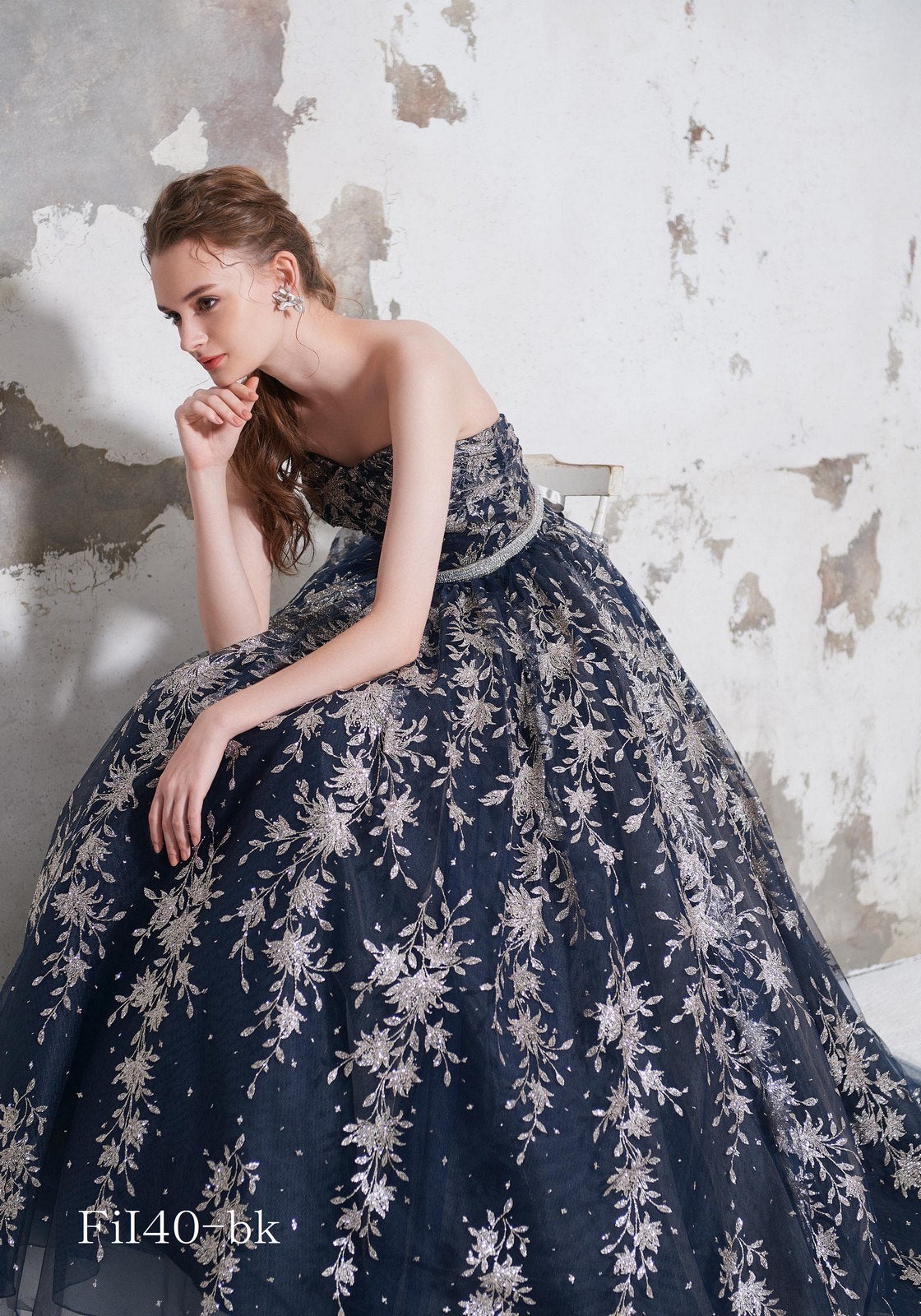 流れるようなボタニカルフラワー柄が華やか で煌びやかなグリッタードレス 細かいパウダーグリッターが軽やかに輝きます。インナーカラーにベージュを入れて透明感を 出しています.ウエストのリボンカラーもパール グレイでクールな印象に!