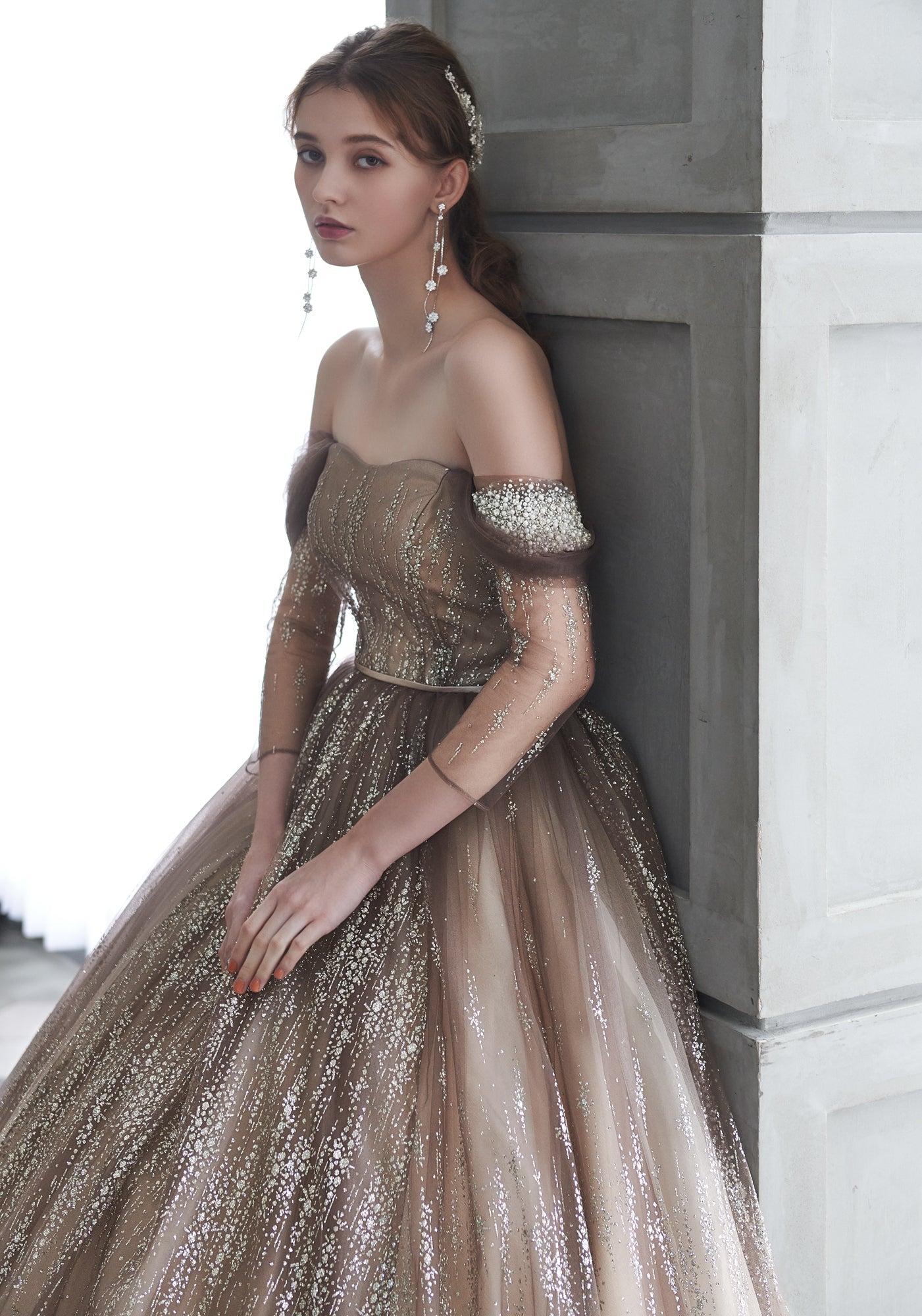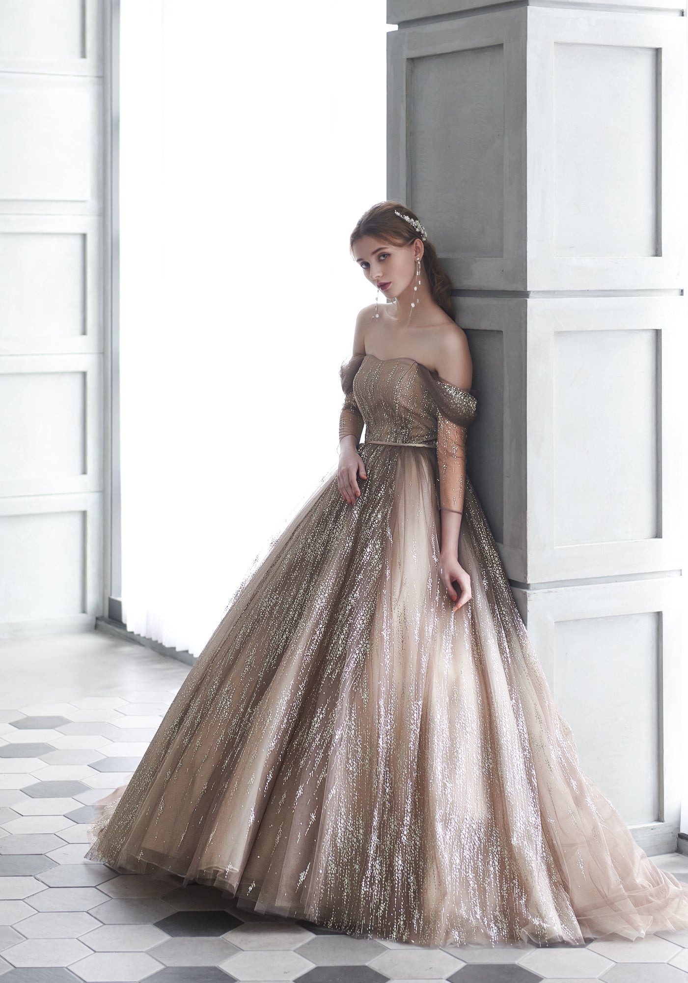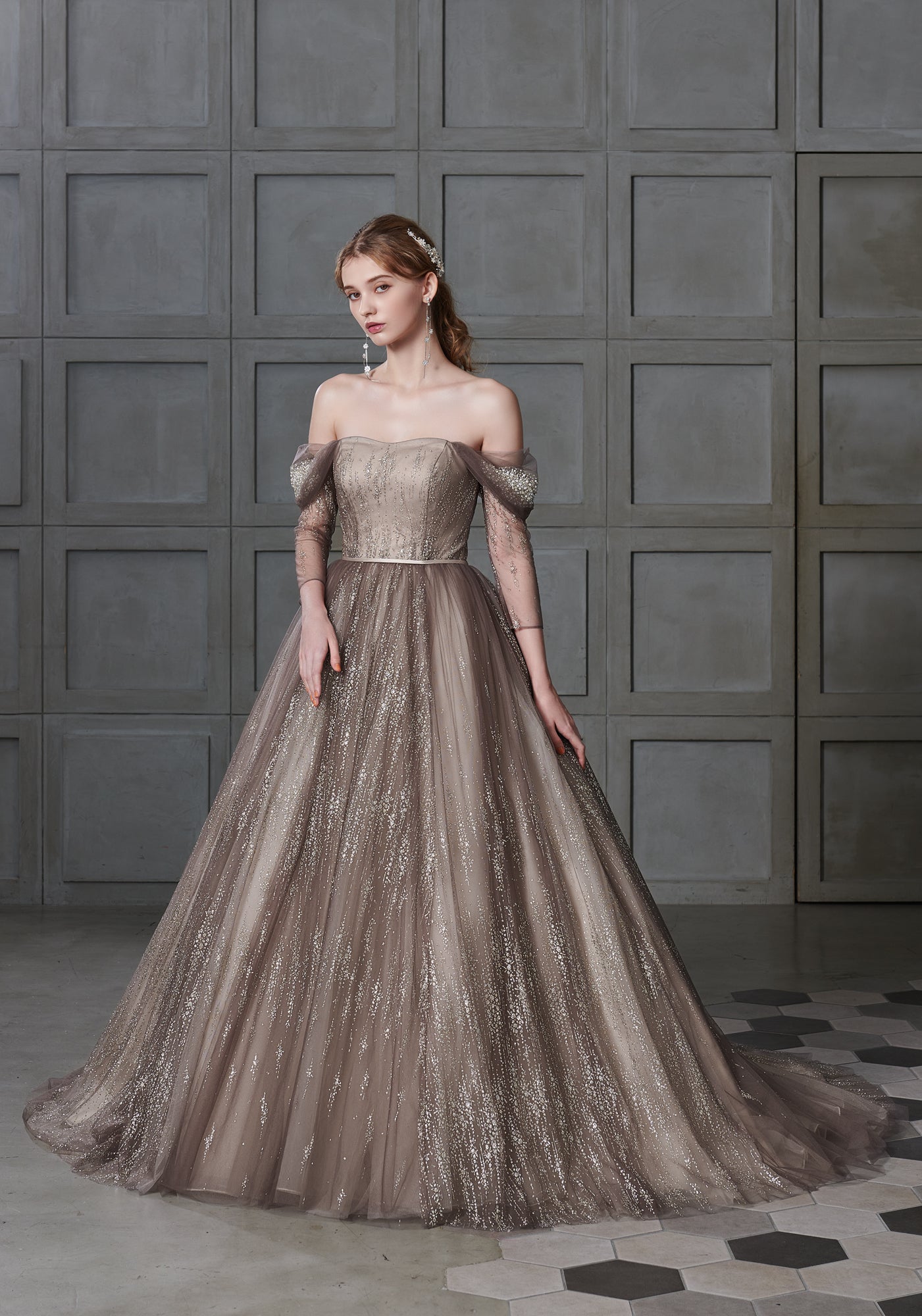 ソフトAラインのシルエットインポートパーツを施したショルダーで二の腕をカバー。グローブスタイルのお袖で簡単にイメージチェンジ!インナーチュールはカラーブロックでニュアンスを出しています。